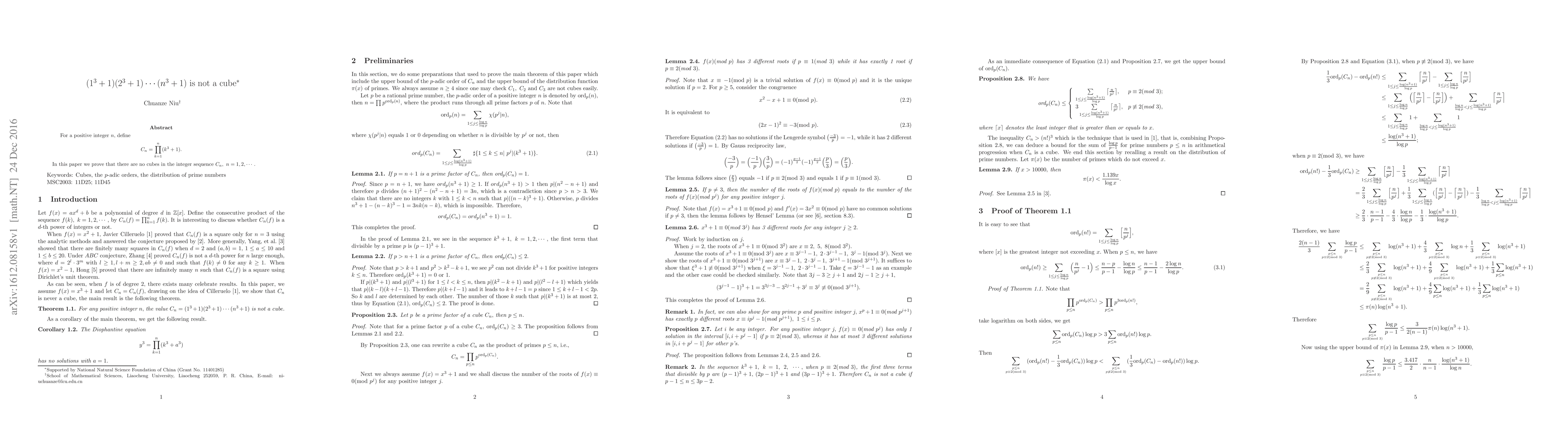 The paper employs number theory techniques, specifically analyzing the p-adic order of the product $C_n = \prod_{k=1}^n (k^3 + 1)$ and bounding the distribution function of primes, π(x).