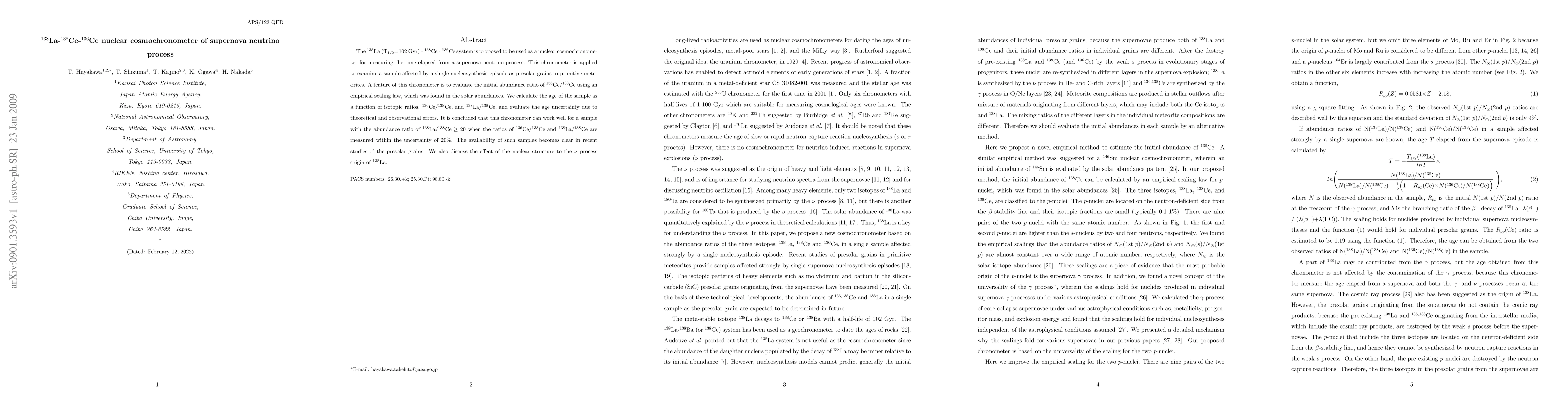 A new nuclear chronometer based on 138La-138Ce-136Ce isotopes can measure time elapsed from supernova neutrino processes with high accuracy. The method uses empirical scaling laws to determine sample ages, which can be applied to analyze presolar grains in primitive meteorites.