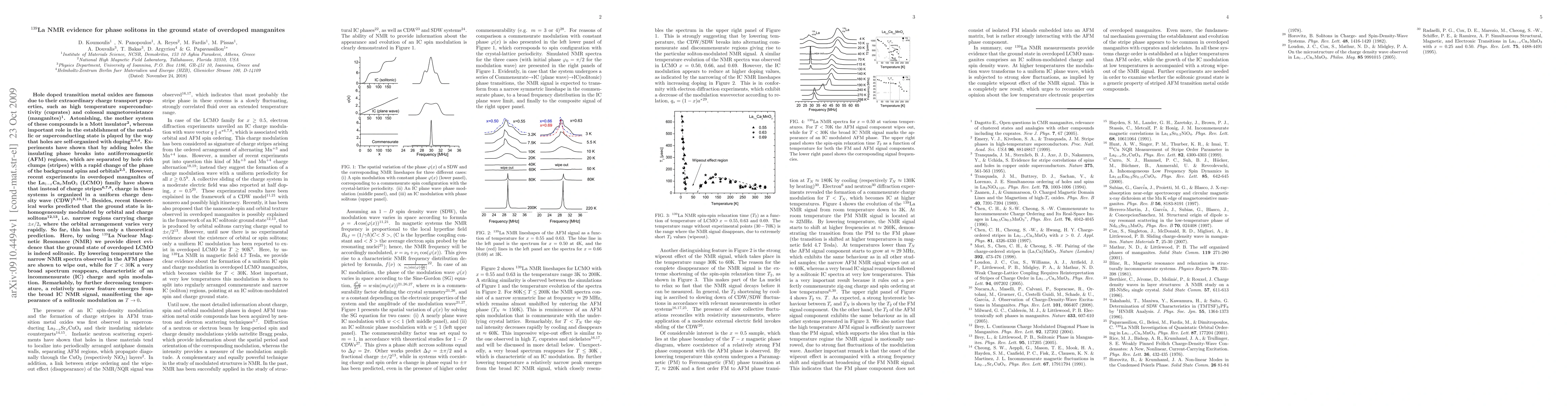 Hole doped transition metal oxides are famous due to their extraordinary charge transport properties, such as high temperature superconductivity (cuprates) and colossal magnetoresistance (manganites). Astonishing, the mother system of these compounds is a Mott insulator, whereas important role in the establishment of the metallic or superconducting state is played by the way that holes are self-organized with doping. Experiments have shown that by adding holes the insulating phase breaks into antiferromagnetic (AFM) regions, which are separated by hole rich clumps (stripes) with a rapid change of the phase of the background spins and orbitals. However, recent experiments in overdoped manganites of the La(1-x)Ca(x)MnO(3) (LCMO) family have shown that instead of charge stripes, charge in these systems is organized in a uniform charge density wave (CDW). Besides, recent theoretical works predicted that the ground state is inhomogeneously modulated by orbital and charge solitons, i.e. narrow regions carrying charge (+/-)e/2, where the orbital arrangement varies very rapidly. So far, this has been only a theoretical prediction. Here, by using 139La Nuclear Magnetic Resonance (NMR) we provide direct evidence that the ground state of overdoped LCMO is indeed solitonic. By lowering temperature the narrow NMR spectra observed in the AFM phase are shown to wipe out, while for T<30K a very broad spectrum reappears, characteristic of an incommensurate (IC) charge and spin modulation. Remarkably, by further decreasing temperature, a relatively narrow feature emerges from the broad IC NMR signal, manifesting the formation of a solitonic modulation as T->0.