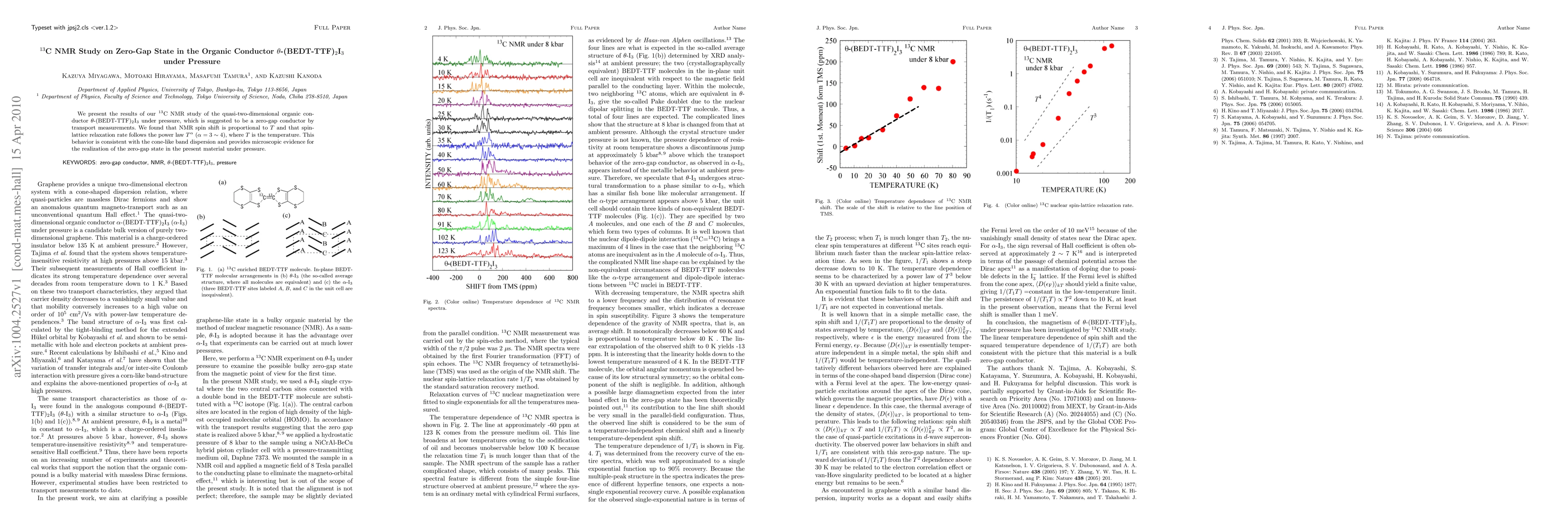 This study uses $^{13}$C NMR to investigate the quasi-two-dimensional organic conductor $\theta$-(BEDT-TTF)$_2$I$_{3}$ under pressure, confirming a zero-gap state through observed $T$-dependent NMR spin shift and spin-lattice relaxation rate following $T^{\alpha}$ with $\alpha$ between 3 and 4. These findings align with cone-like band dispersion, supporting the material's zero-gap state.
