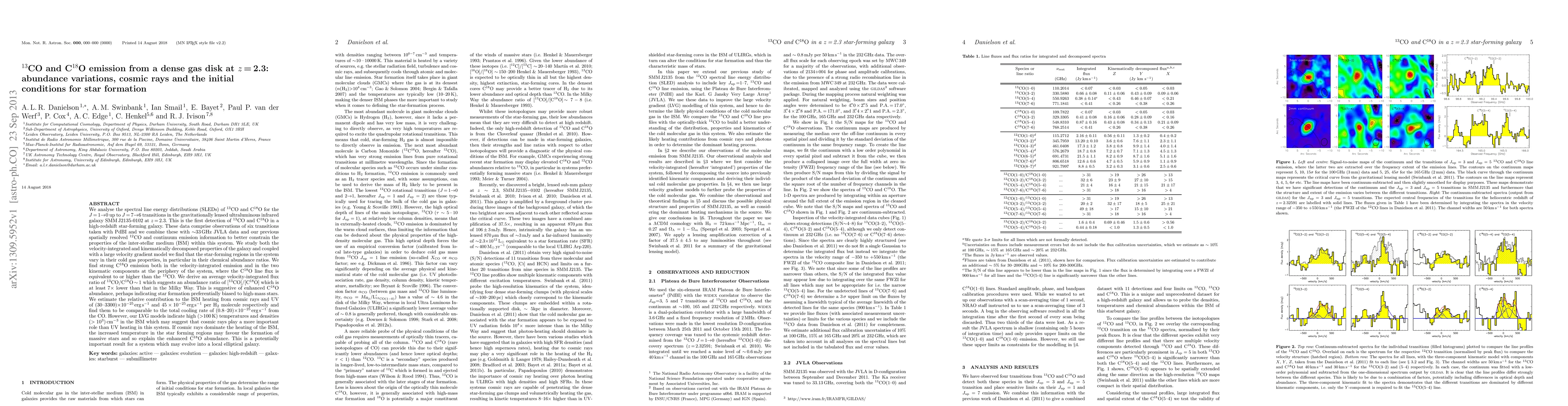 We analyse the SLEDs of 13CO and C18O for the J=1-0 up to J=7-6 transitions in the gravitationally lensed ultraluminous infrared galaxy SMMJ2135-0102 at z=2.3. This is the first detection of 13CO and C18O in a high-redshift star-forming galaxy. These data comprise observations of six transitions taken with PdBI and we combine these with 33GHz JVLA data and our previous 12CO and continuum emission information to better constrain the properties of the ISM within this system. We study both the velocity-integrated and kinematically decomposed properties of the galaxy and coupled with an LVG model we find that the star-forming regions in the system vary in their cold gas properties. We find strong C18O emission both in the velocity-integrated emission and in the two kinematic components at the periphery of the system, where the C18O line flux is equivalent to or higher than the 13CO. We derive an average velocity-integrated flux ratio of 13CO/C18O~1 suggesting a [13CO]/[C18O] abundance ratio at least 7x lower than that in the Milky Way. This may suggest enhanced C18O abundance, perhaps indicating star formation preferentially biased to high-mass stars. We estimate the relative contribution to the ISM heating from cosmic rays and UV of (30-3300)x10^(-25)erg/s and 45x10^(-25)erg/s per H2 molecule respectively and both are comparable to the total cooling rate of (0.8-20)x10^(-25)erg/s from the CO. However, our LVG models indicate high (>100K) temperatures and densities (>10^(3))cm^(-3) in the ISM which may suggest that cosmic rays play a more important role than UV heating in this system. If cosmic rays dominate the heating of the ISM, the increased temperature in the star forming regions may favour the formation of massive stars and so explain the enhanced C18O abundance. This is a potentially important result for a system which may evolve into a local elliptical galaxy.