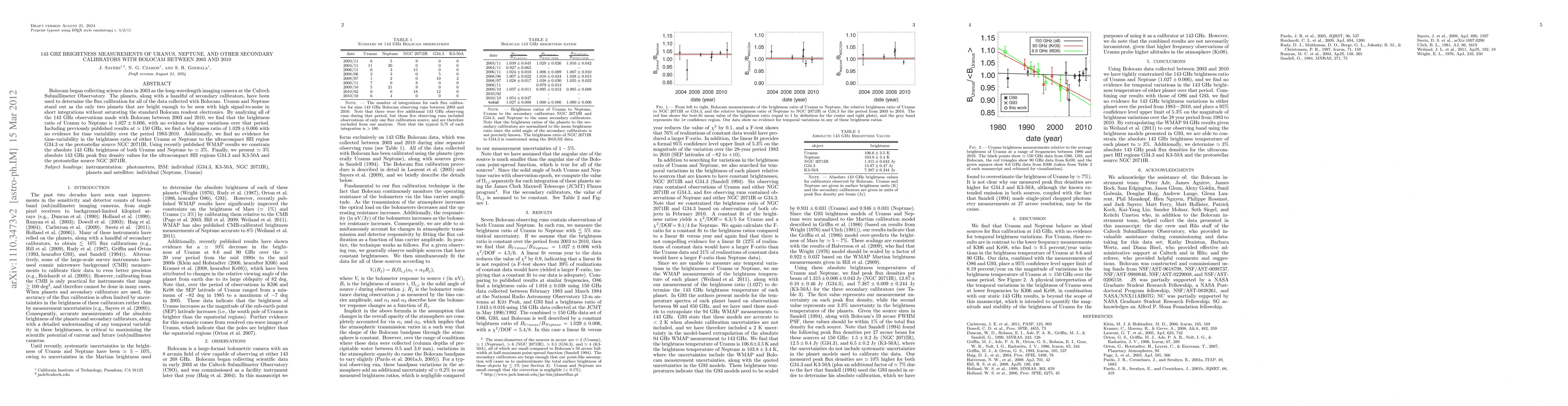 Bolocam began collecting science data in 2003 as the long-wavelength imaging camera at the Caltech Submillimeter Observatory. The planets, along with a handful of secondary calibrators, have been used to determine the flux calibration for all of the data collected with Bolocam. Uranus and Neptune stand out as the only two planets that are bright enough to be seen with high signal-to-noise in short integrations without saturating the standard Bolocam readout electronics. By analyzing all of the 143 GHz observations made with Bolocam between 2003 and 2010, we find that the brightness ratio of Uranus to Neptune is 1.027 +- 0.006, with no evidence for any variations over that period. Including previously published results at \simeq 150 GHz, we find a brightness ratio of 1.029 +- 0.006 with no evidence for time variability over the period 1983-2010. Additionally, we find no evidence for time-variability in the brightness ratio of either Uranus or Neptune to the ultracompact HII region G34.3 or the protostellar source NGC 2071IR. Using recently published WMAP results we constrain the absolute 143 GHz brightness of both Uranus and Neptune to ~3%. Finally, we present ~3% absolute 143 GHz peak flux density values for the ultracompact HII regions G34.3 and K3-50A and the protostellar source NGC 2071IR.