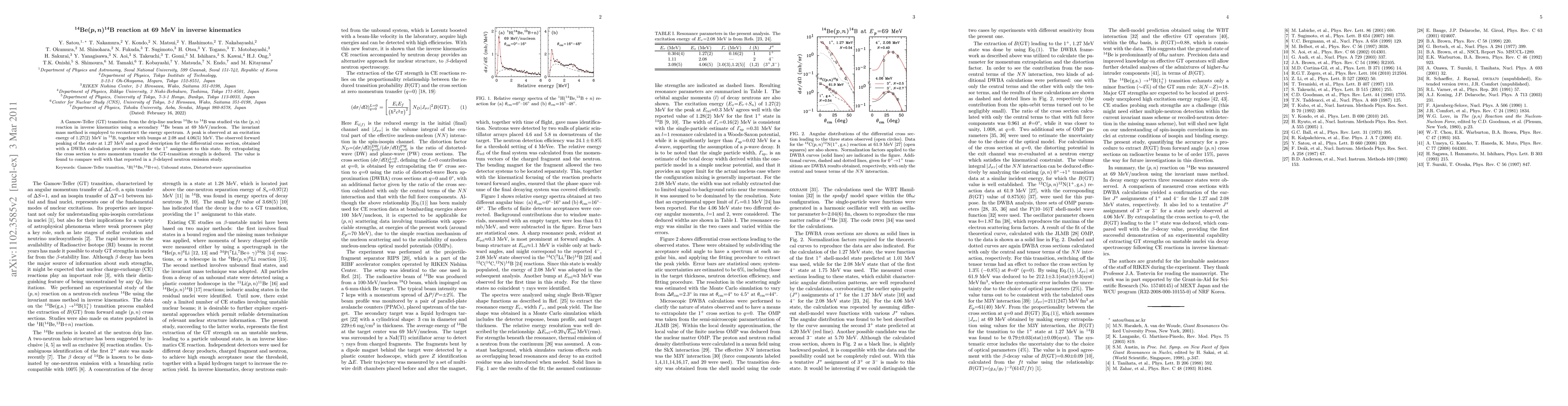 A Gamow-Teller (GT) transition from the drip-line nucleus 14Be to 14B was studied via the (p,n) reaction in inverse kinematics using a secondary 14Be beam at 69 MeV/nucleon. The invariant mass method is employed to reconstruct the energy spectrum. A peak is observed at an excitation energy of 1.27(2) MeV in 14B, together with bumps at 2.08 and 4.06(5) MeV. The observed forward peaking of the state at 1.27 MeV and a good description for the differential cross section, obtained with a DWBA calculation provide support for the 1+ assignment to this state. By extrapolating the cross section to zero momentum transfer the GT-transition strength is deduced. The value is found to compare well with that reported in a beta-delayed neutron emission study.