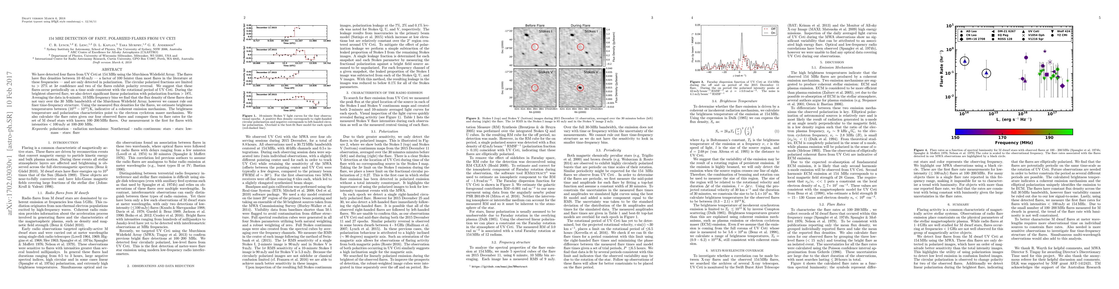 We have detected four flares from UV Ceti at 154 MHz using the Murchison Widefield Array. The flares have flux densities between 10--65 mJy --- a factor of 100 fainter than most flares in the literature at these frequencies --- and are only detected in polarization. The circular polarized fractions are limited to $>27$% at 3$\sigma$ confidence and two of the flares exhibit polarity reversal. We suggest that these flares occur periodically on a time scale consistent with the rotational period of UV Ceti. During the brightest observed flare, we also detect significant linear polarization with polarization fraction $>18$%. Averaging the data in 6-minute, 10 MHz frequency bins we find that the flux density of these flares does not vary over the 30 MHz bandwidth of the Murchison Widefield Array, however we cannot rule out finer time-frequency structure. Using the measured flux densities for the flares, we estimate brightness temperatures between $(10^{13}-10^{14})\,$K, indicative of a coherent emission mechanism. The brightness temperature and polarization characteristics point to the electron cyclotron maser mechanism. We also calculate the flare rates given our four observed flares and compare them to flare rates for the set of M dwarf stars with known 100--200 MHz flares. Our measurement is the first for flares with intensities $<100$ mJy at 100-200 MHz.