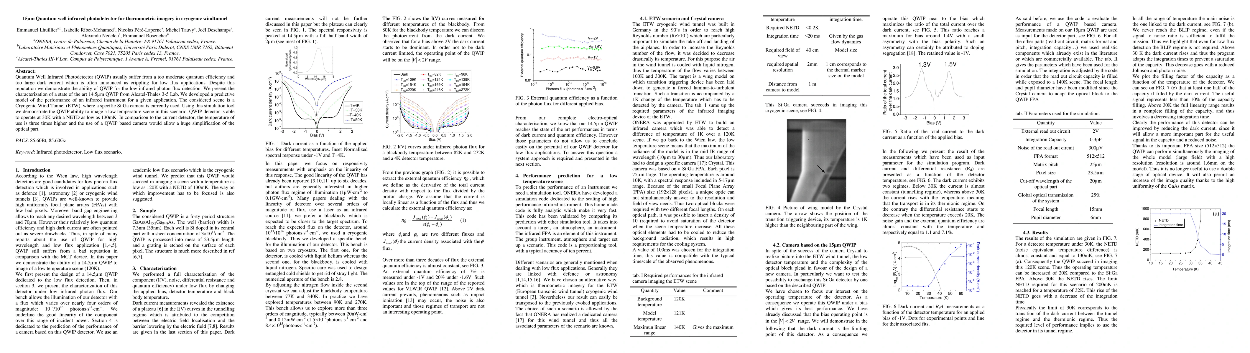 This research demonstrates the potential of Quantum Well Infrared Photodetectors (QWIP) for detecting low infrared photon flux, despite their reputation for moderate quantum efficiency and large dark current. The paper presents a characterization of a 14.5mu m QWIP from Alcatel-Thales 3-5 Lab, operating at 30K with a Noise Equivalent Temperature Difference (NETD) as low as 130mK. A predictive model shows QWIP's capability to image a low-temperature scene in a Cryogenic Wind Tunnel, offering a higher operational temperature and optical simplification compared to the current Si:Ga camera.
