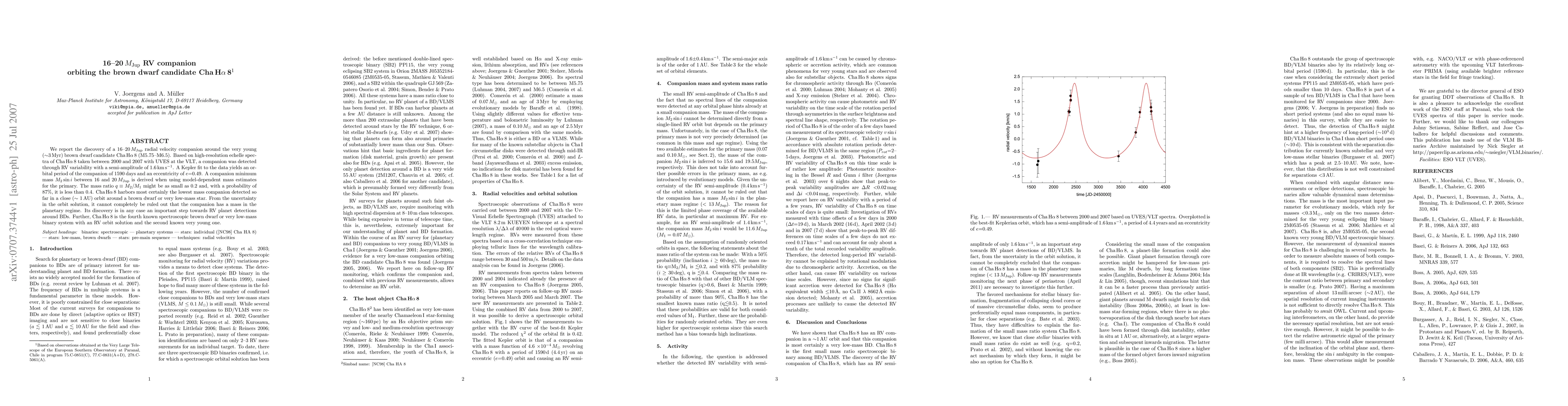 This paper reports the discovery of a 16-20 Jupiter mass radial velocity companion orbiting the young brown dwarf candidate ChaHa8 with a period of 1590 days and an eccentricity of 0.49. The companion's detection is significant as it may represent the lowest mass companion found in a close orbit around a brown dwarf, potentially extending the understanding of RV planet detections around such objects.