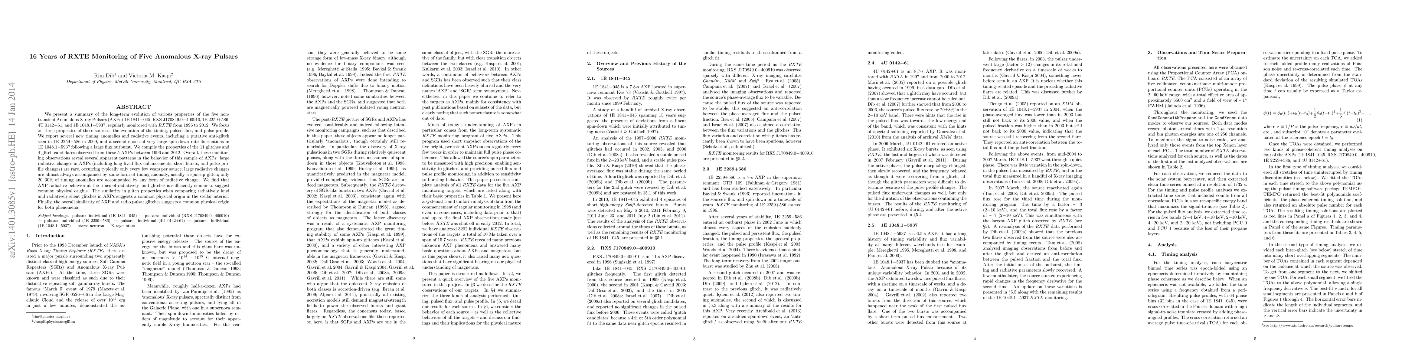 This paper summarizes 16 years of RXTE observations of five Anomalous X-ray Pulsars, focusing on timing, pulsed flux, and pulse profile evolution. It reports new timing anomalies and radiative events, revealing patterns in the behavior of these pulsars, suggesting common physical origins for their glitches and radiative changes.