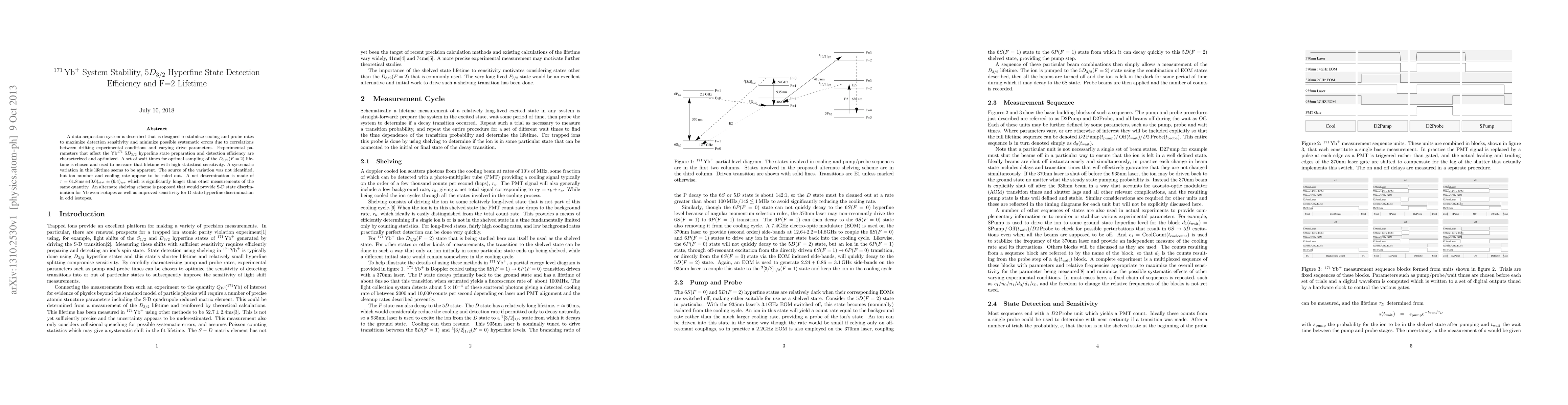 A data acquisition system is described that is designed to stabilize cooling and probe rates to maximize detection sensitivity and minimize possible systematic errors due to correlations between drifting experimental conditions and varying drive parameters. Experimental parameters that affect the Yb171 5D3/2 hyperfine state preparation and detection efficiency are characterized and optimized. A set of wait times for optimal sampling of the D3/2(F=2) lifetime is chosen and used to measure that lifetime with high statistical sensitivity. A systematic variation in this lifetime seems to be apparent. The source of the variation was not identified, but ion number and cooling rate appear to be ruled out. A net determination is made of tau=61.8ms+-(0.6)_stat+-(6.4)_sys which is significantly longer than other measurements of the same quantity. An alternate shelving scheme is proposed that would provide S-D state discrimination for Yb even isotopes as well as improved sensitivity for D state hyperfine discrimination in odd isotopes.