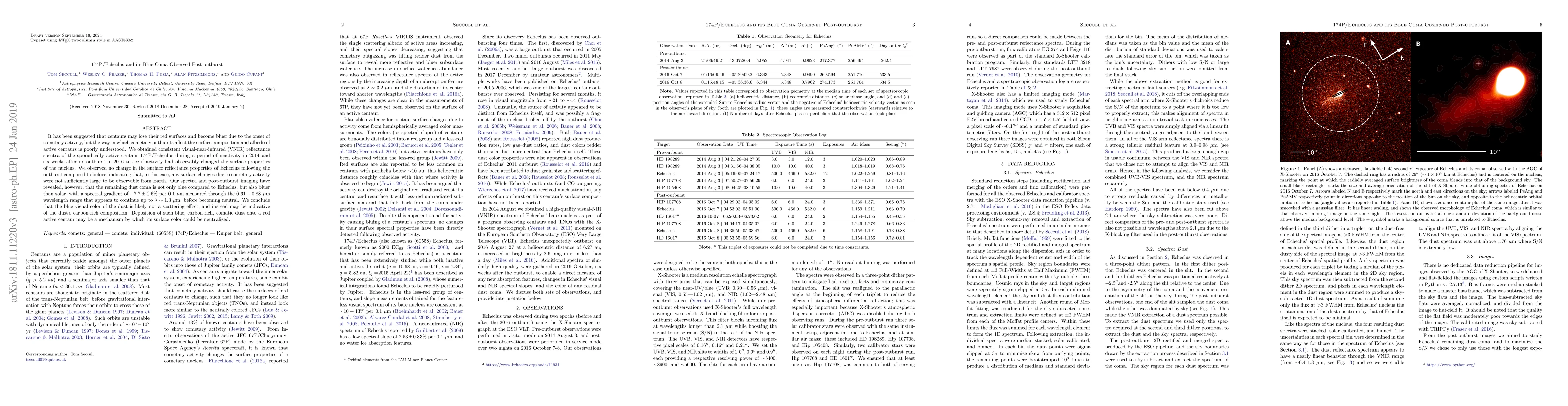 It has been suggested that centaurs may lose their red surfaces and become bluer due to the onset of cometary activity, but the way in which cometary outbursts affect the surface composition and albedo of active centaurs is poorly understood. We obtained consistent visual-near-infrared (VNIR) reflectance spectra of the sporadically active centaur 174P/Echeclus during a period of inactivity in 2014 and six weeks after its outburst in 2016 to see if activity had observably changed the surface properties of the nucleus. We observed no change in the surface reflectance properties of Echeclus following the outburst compared to before, indicating that, in this case, any surface changes due to cometary activity were not sufficiently large to be observable from Earth. Our spectra and post-outburst imaging have revealed, however, that the remaining dust coma is not only blue compared to Echeclus, but also bluer than solar, with a spectral gradient of -7.7+/-0.6% per 0.1 micron measured through the 0.61-0.88 micron wavelength range that appears to continue up to a wavelength of around 1.3 micron before becoming neutral. We conclude that the blue visual color of the dust is likely not a scattering effect, and instead may be indicative of the dust's carbon-rich composition. Deposition of such blue, carbon-rich, comatic dust onto a red active centaur may be a mechanism by which its surface color could be neutralized.
