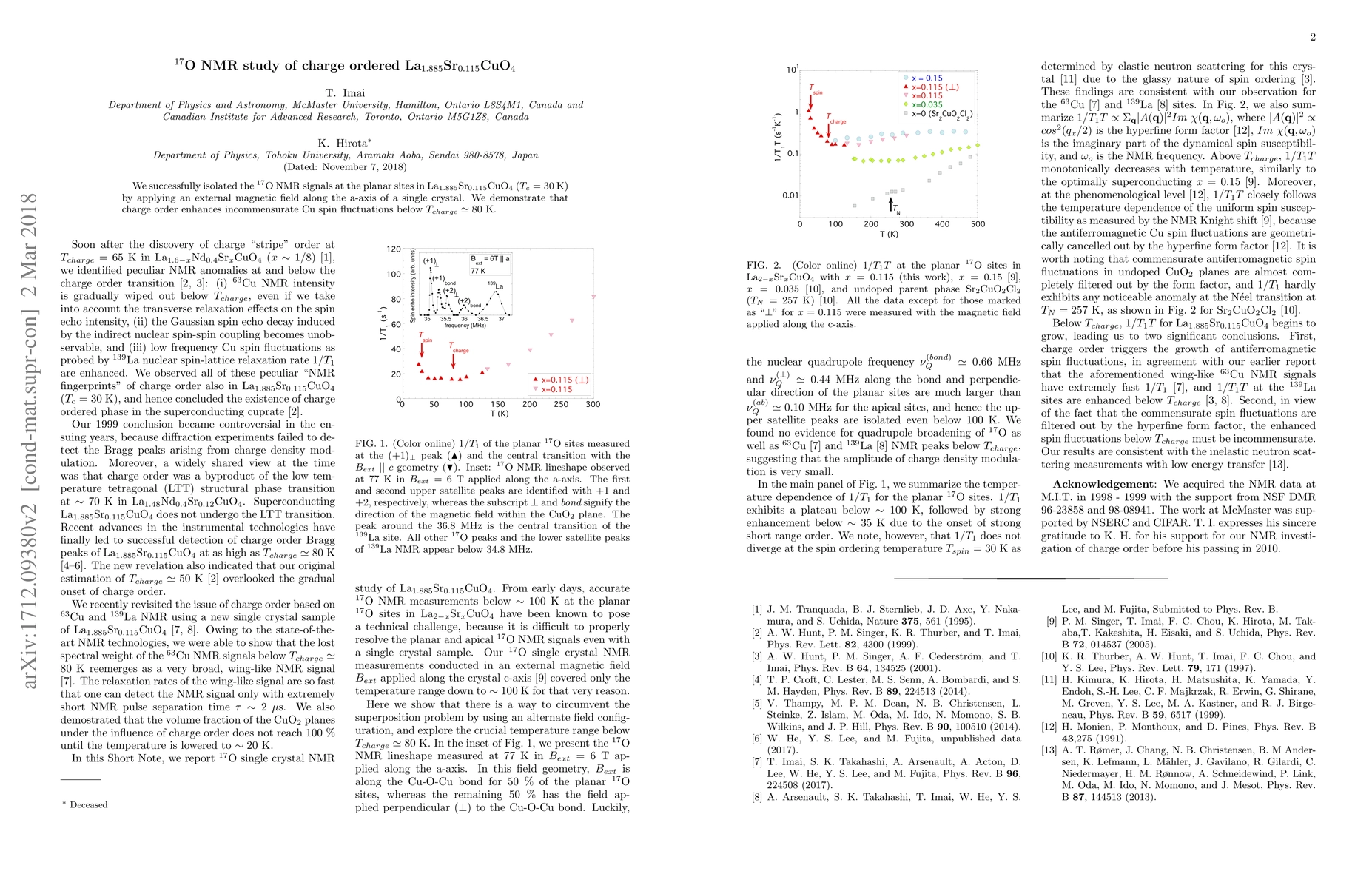 Researchers used $^{17}$O NMR to study La$_{1.885}$Sr$_{0.115}$CuO$_4$, finding that charge order enhances incommensurate Cu spin fluctuations below 80 K.