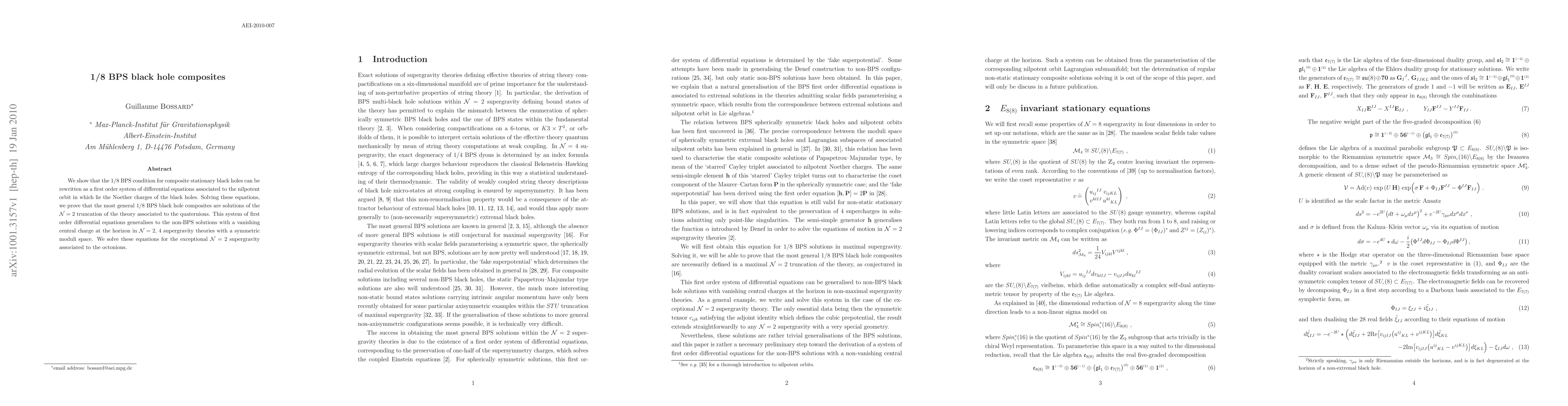We show that the 1/8 BPS condition for composite stationary black holes can be rewritten as a first order system of differential equations associated to the nilpotent orbit in which lie the Noether charges of the black holes. Solving these equations, we prove that the most general 1/8 BPS black hole composites are solutions of the N=2 truncation of the theory associated to the quaternions. This system of first order differential equations generalises to the non-BPS solutions with a vanishing central charge at the horizon in N=2, 4 supergravity theories with a symmetric moduli space. We solve these equations for the exceptional N=2 supergravity associated to the octonions.