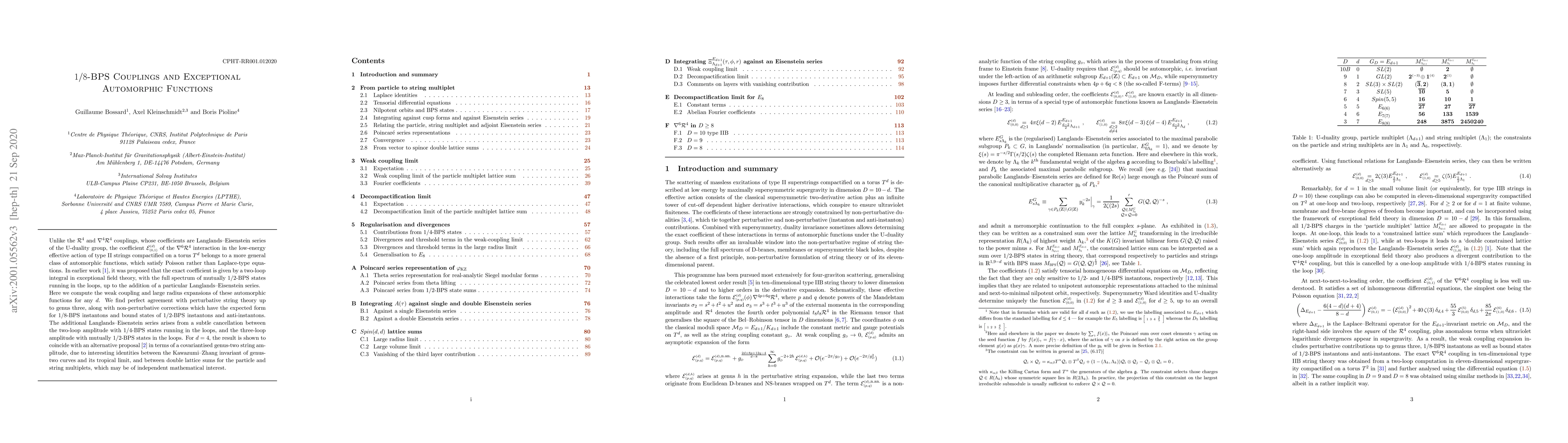 This paper explores the 1/8-BPS couplings in type II string theory, revealing that the coefficient of a specific $\nabla^6\mathcal{R}^4$ interaction is an exceptional automorphic function. It confirms the proposed two-loop integral expression for these coefficients, showing agreement with perturbative string theory and identifying non-perturbative corrections associated with 1/8-BPS instantons.