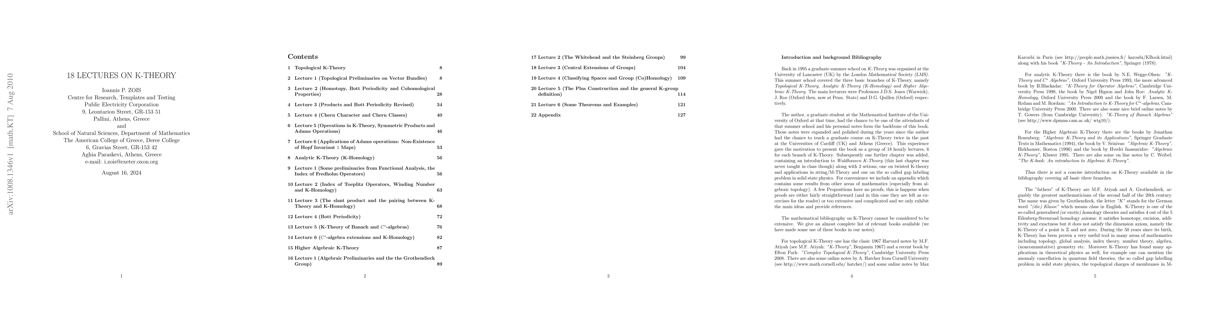 This paper offers 18 lectures introducing K-Theory's three main branches: topological, analytic (K-homology), and higher algebraic K-Theory, each section comprising 6 lectures. The material is based on the author's notes from a 1995 graduate summer school organized by the London Mathematical Society.