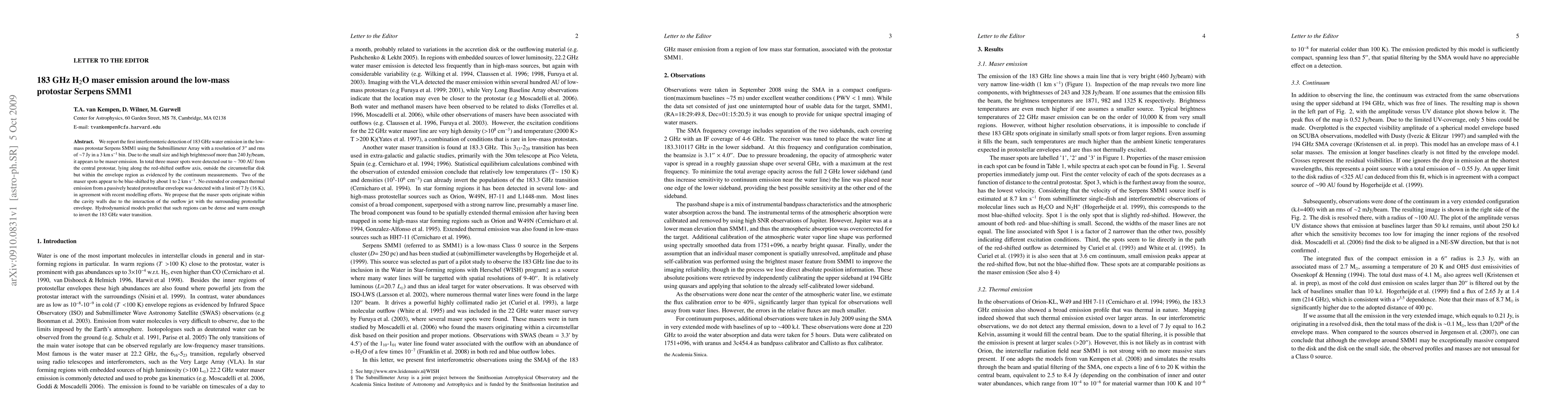 We report the first interferomteric detection of 183 GHz water emission in the low-mass protostar Serpens SMM1 using the Submillimeter Array with a resolution of 3$"$ and rms of $\sim$7 Jy in a 3 km s$^{-1}$ bin. Due to the small size and high brightnessof more than 240 Jy/beam, it appears to be maser emission. In total three maser spots were detected out to $\sim$ 700 AU from the central protostar, lying along the red-shifted outflow axis, outside the circumstellar disk but within the envelope region as evidenced by the continuum measurements. Two of the maser spots appear to be blue-shifted by about 1 to 2 km s$^{-1}$. No extended or compact thermal emission from a passively heated protostellar envelope was detected with a limit of 7 Jy (16 K), in agreement with recent modelling efforts. We propose that the maser spots originate within the cavity walls due to the interaction of the outflow jet with the surrounding protostellar envelope. Hydrodynamical models predict that such regions can be dense and warm enough to invert the 183 GHz water transition.