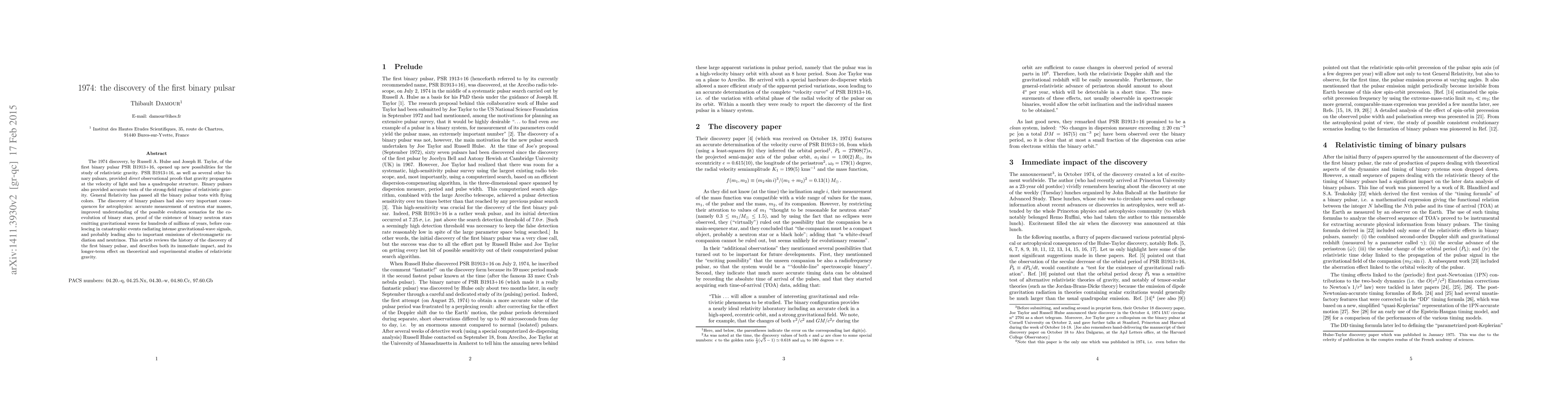 The 1974 discovery of the first binary pulsar PSR B1913+16 by Hulse and Taylor provided direct evidence for the propagation of gravity at the speed of light and its quadrupolar nature, significantly advancing tests of General Relativity and neutron star astrophysics. This discovery has profoundly influenced theoretical and experimental studies in relativistic gravity and neutron star evolution.