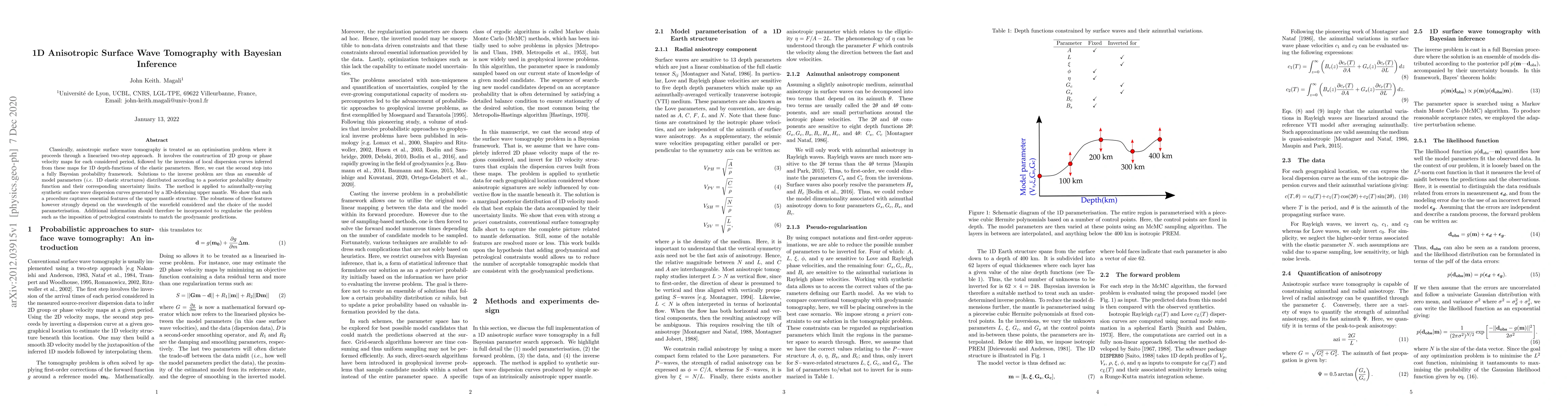 This paper proposes a Bayesian inference approach for 1D anisotropic surface wave tomography, generating an ensemble of 1D elastic structures with associated uncertainty. The method is tested on synthetic data, demonstrating its ability to capture upper mantle features but highlighting the need for additional regularization, such as petrological constraints.