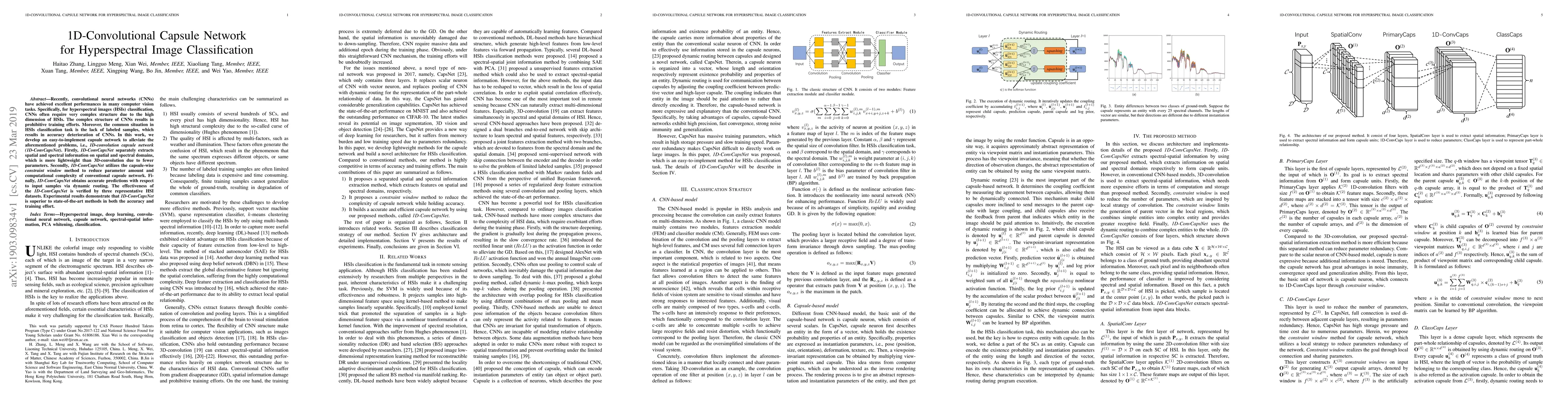 This paper proposes a 1D-convolutional capsule network (1D-ConvCapsNet) for hyperspectral image classification, which efficiently extracts spatial and spectral information while reducing complexity and training effort. Experimental results show that 1D-ConvCapsNet outperforms existing methods in accuracy and computational efficiency.