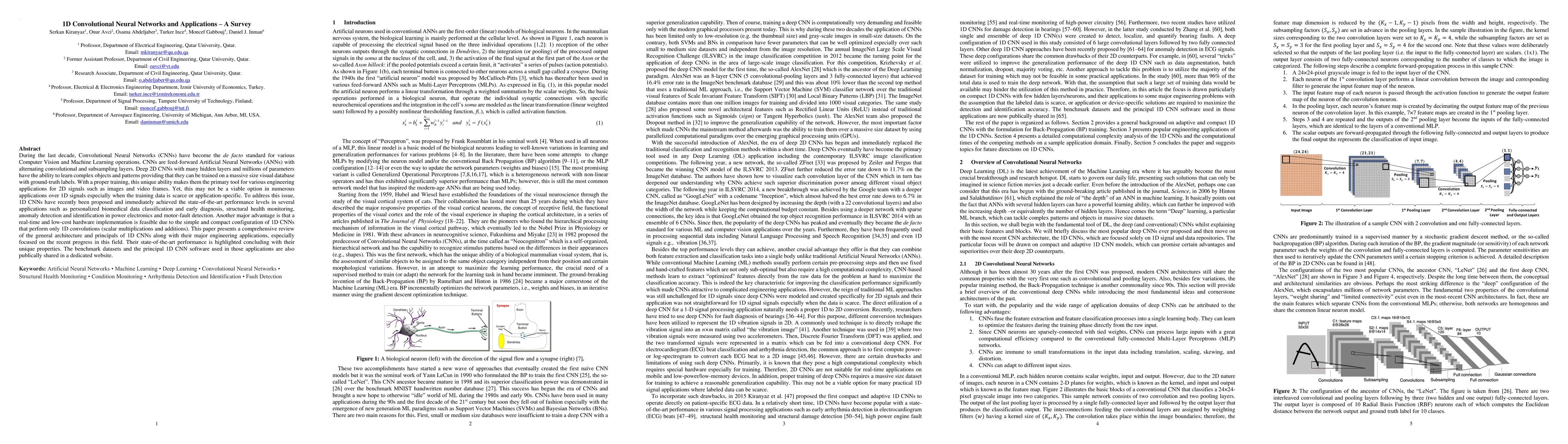 A comprehensive survey on the engineering applications of compact 1D Convolutional Neural Networks (CNNs) is presented.