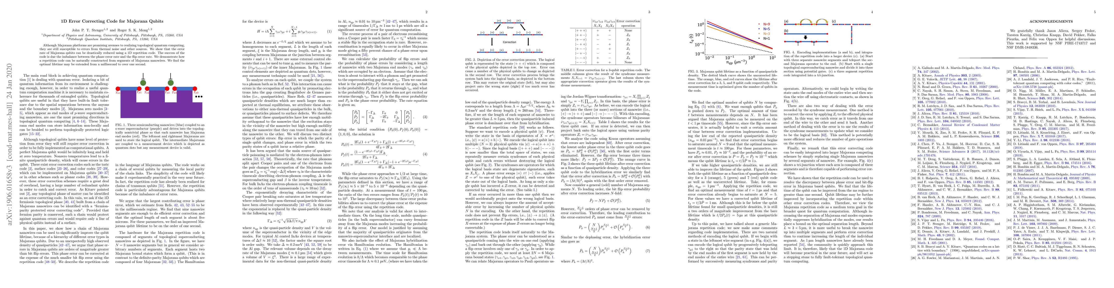 Although Majorana platforms are promising avenues to realizing topological quantum computing, they are still susceptible to errors from thermal noise and other sources. We show that the error rate of Majorana qubits can be drastically reduced using a 1D repetition code. The success of the code is due the imbalance between the phase error rate and the flip error rate. We demonstrate how a repetition code can be naturally constructed from segments of Majorana nanowires. We find the optimal lifetime may be extended from a millisecond to over one second.