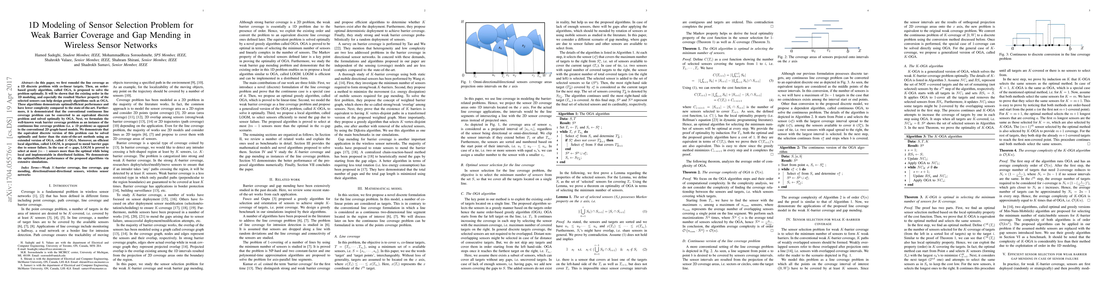 This paper proposes a 1D discrete modeling for line coverage and weak barrier coverage in wireless sensor networks, introducing an optimal greedy algorithm (OGA) and its extended version (K-OGA) for solving these problems. The paper also presents a local algorithm (LOGM) for gap mending, demonstrating optimal performance and lower complexity compared to existing methods.