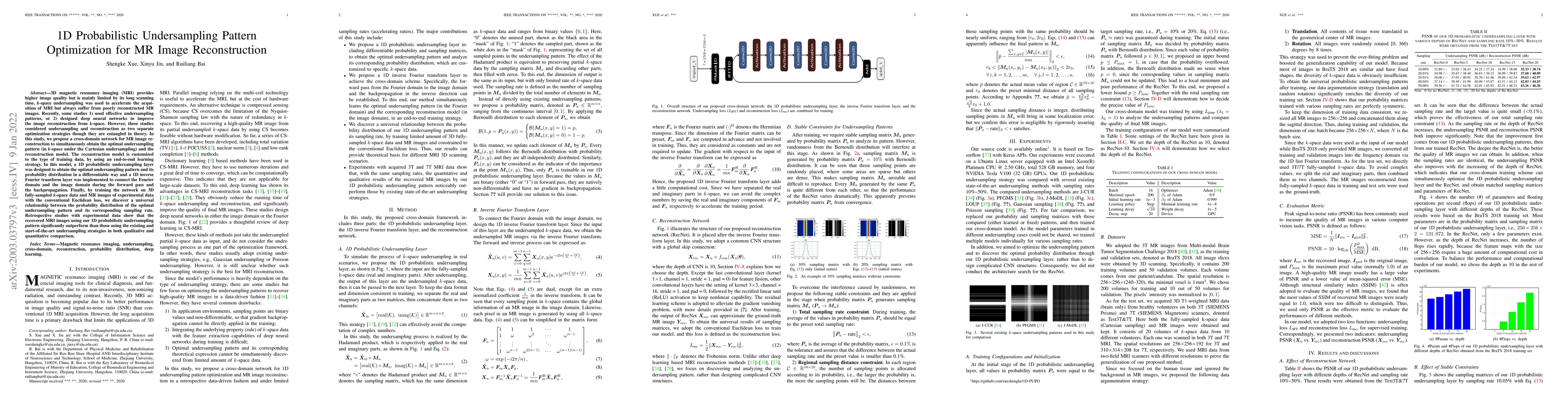 This paper proposes a cross-domain network for MRI reconstruction using 1D probabilistic undersampling patterns to optimize both undersampling and reconstruction. The method integrates an end-to-end learning strategy to simultaneously determine optimal undersampling patterns and reconstruction models, significantly improving image quality compared to existing strategies.