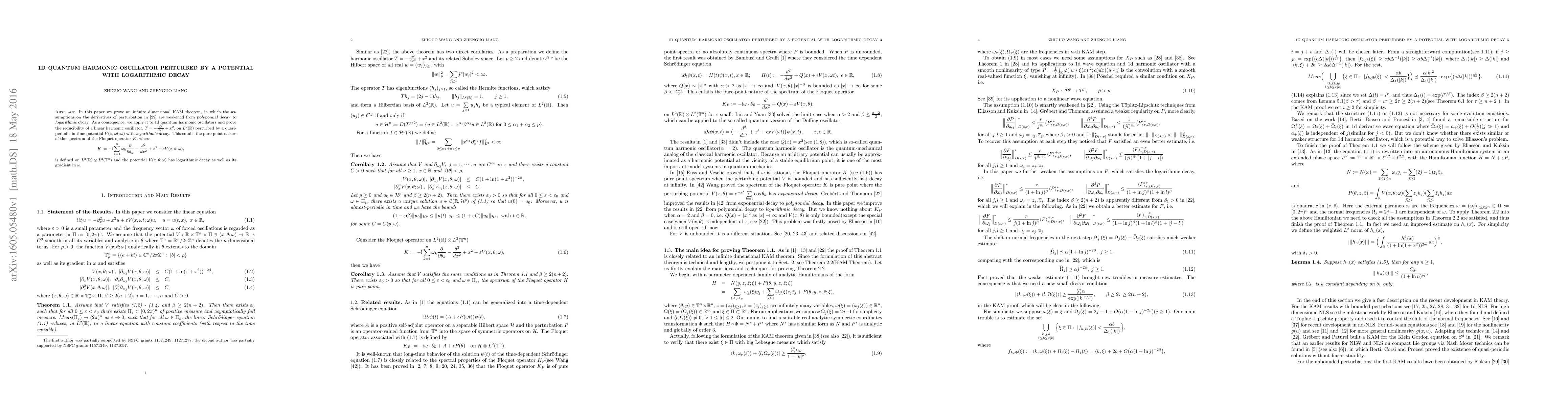 This paper proves an infinite dimensional KAM theorem with weakened assumptions on perturbation decay, applying it to a 1d quantum harmonic oscillator perturbed by a quasi-periodic potential with logarithmic decay, demonstrating the reducibility and pure-point spectrum of the Floquet operator.