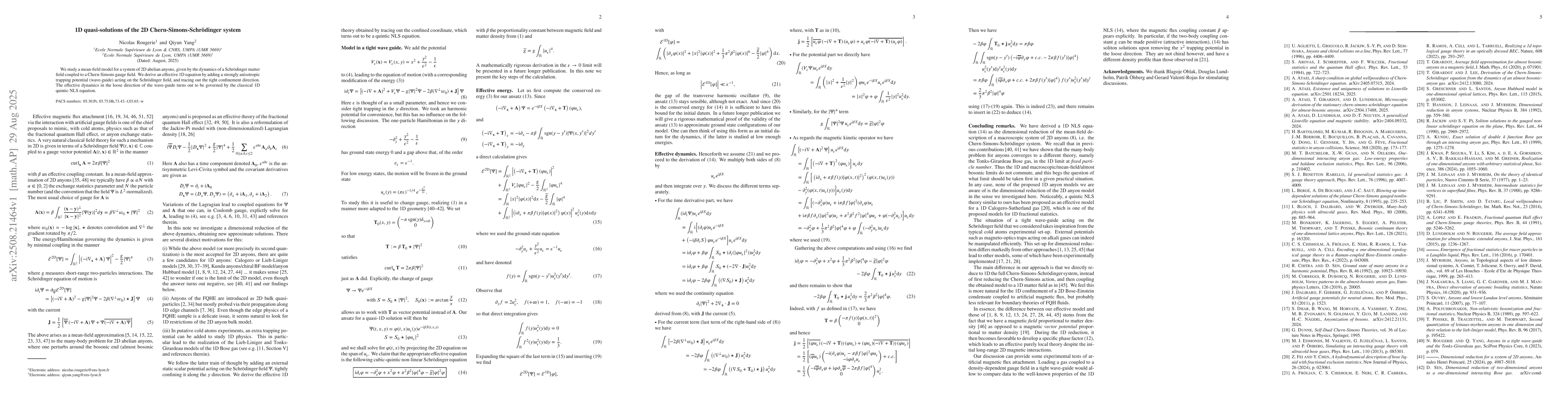 We study a mean-field model for a system of 2D abelian anyons, given by the dynamics of a Schr{\"o}dinger matter field coupled to a Chern-Simons gauge field. We derive an effective 1D equation by adding a strongly anisotropic trapping potential (wave-guide) acting on the Schr{\"o}dinger field, and tracing out the tight confinement direction. The effective dynamics in the loose direction of the wave-guide turns out to be governed by the classical 1D quintic NLS equation.