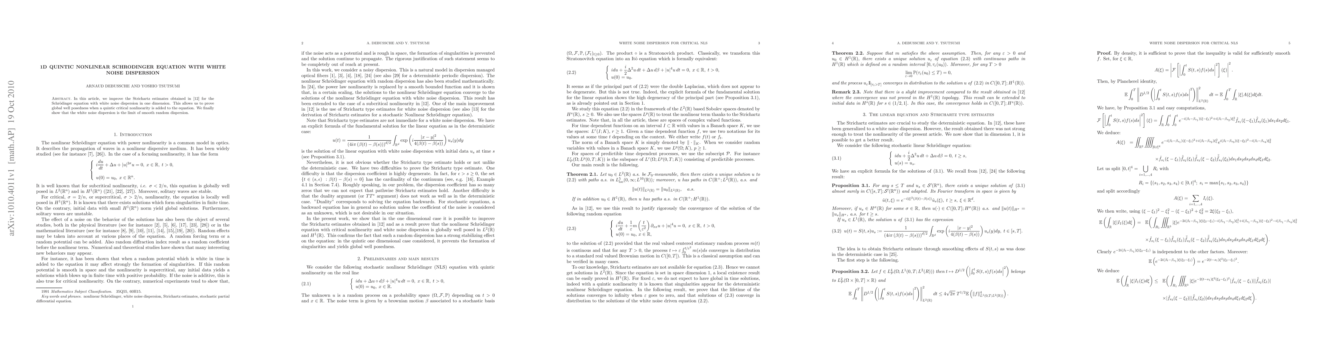This paper enhances Strichartz estimates for the 1D Schrödinger equation with white noise dispersion, enabling the proof of global well-posedness for a quintic nonlinear term. It also demonstrates that white noise dispersion converges to smooth random dispersion.