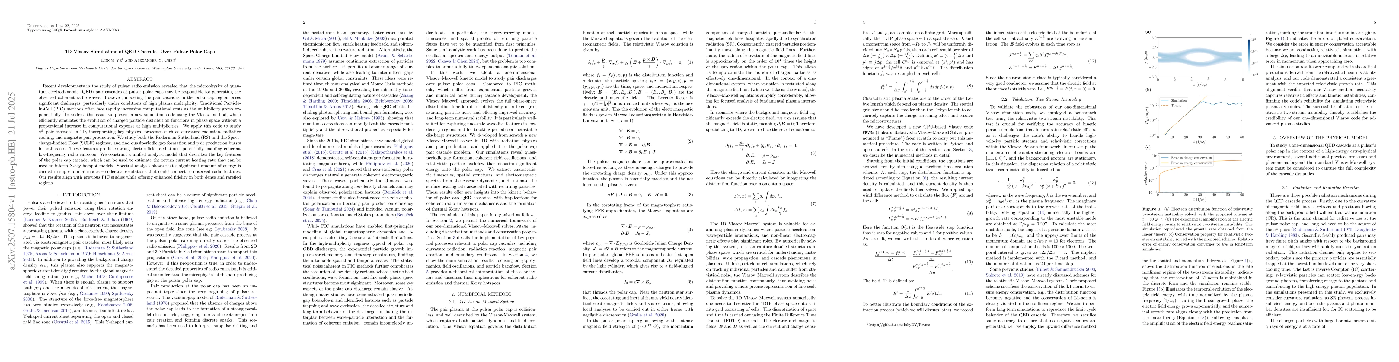 Recent developments in the study of pulsar radio emission revealed that the microphysics of quantum electrodynamic (QED) pair cascades at pulsar polar caps may be responsible for generating the observed coherent radio waves. However, modeling the pair cascades in the polar cap region poses significant challenges, particularly under conditions of high plasma multiplicity. Traditional Particle-in-Cell (PIC) methods often face rapidly increasing computational costs as the multiplicity grows exponentially. To address this issue, we present a new simulation code using the Vlasov method, which efficiently simulates the evolution of charged particle distribution functions in phase space without a proportional increase in computational expense at high multiplicities. We apply this code to study $e^\pm$ pair cascades in 1D, incorporating key physical processes such as curvature radiation, radiative cooling, and magnetic pair production. We study both the Ruderman-Sutherland (RS) and the Space-charge-limited Flow (SCLF) regimes, and find quasiperiodic gap formation and pair production bursts in both cases. These features produce strong electric field oscillations, potentially enabling coherent low-frequency radio emission. We construct a unified analytic model that describes the key features of the polar cap cascade, which can be used to estimate the return current heating rate that can be used to inform X-ray hotspot models. Spectral analysis shows that a significant amount of energy is carried in superluminal modes -- collective excitations that could connect to observed radio features. Our results align with previous PIC studies while offering enhanced fidelity in both dense and rarefied regions.
