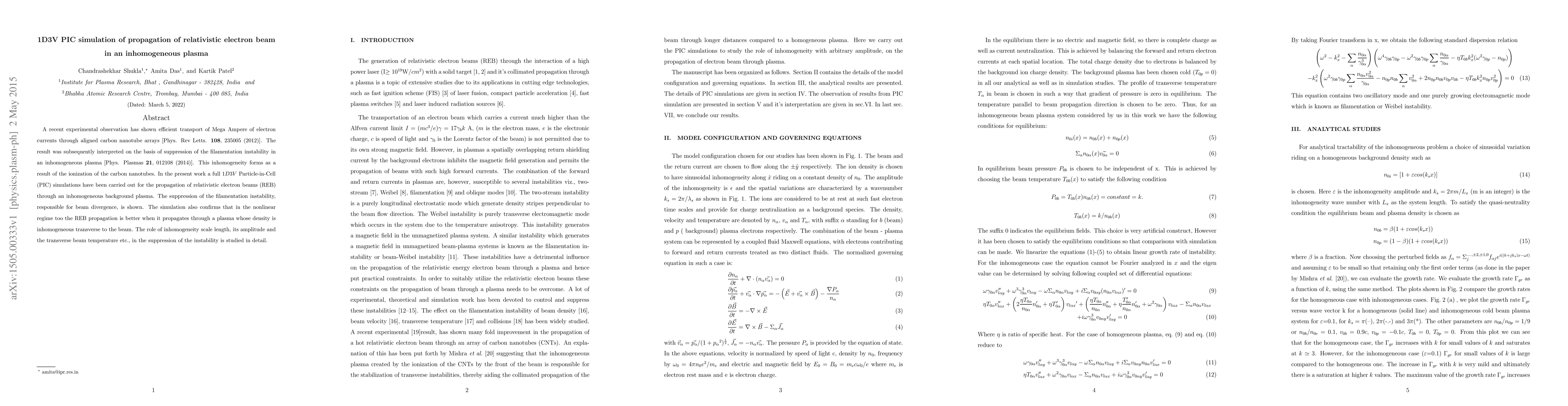 This paper uses 1D3V PIC simulations to study the propagation of relativistic electron beams in an inhomogeneous plasma, showing that such inhomogeneity suppresses filamentation instability, thus reducing beam divergence. The study details the effects of inhomogeneity scale length, amplitude, and transverse beam temperature on instability suppression.