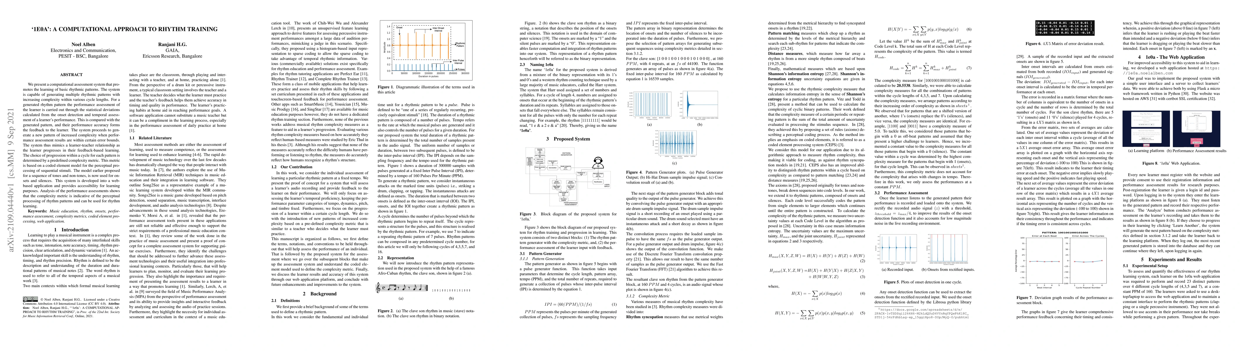 We present a computational assessment system that promotes the learning of basic rhythmic patterns. The system is capable of generating multiple rhythmic patterns with increasing complexity within various cycle lengths. For a generated rhythm pattern the performance assessment of the learner is carried out through the statistical deviations calculated from the onset detection and temporal assessment of a learner's performance. This is compared with the generated pattern, and their performance accuracy forms the feedback to the learner. The system proceeds to generate a new pattern of increased complexity when performance assessment results are within certain error bounds. The system thus mimics a learner-teacher relationship as the learner progresses in their feedback-based learning. The choice of progression within a cycle for each pattern is determined by a predefined complexity metric. This metric is based on a coded element model for the perceptual processing of sequential stimuli. The model earlier proposed for a sequence of tones and non-tones, is now used for onsets and silences. This system is developed into a web-based application and provides accessibility for learning purposes. Analysis of the performance assessments shows that the complexity metric is indicative of the perceptual processing of rhythm patterns and can be used for rhythm learning.