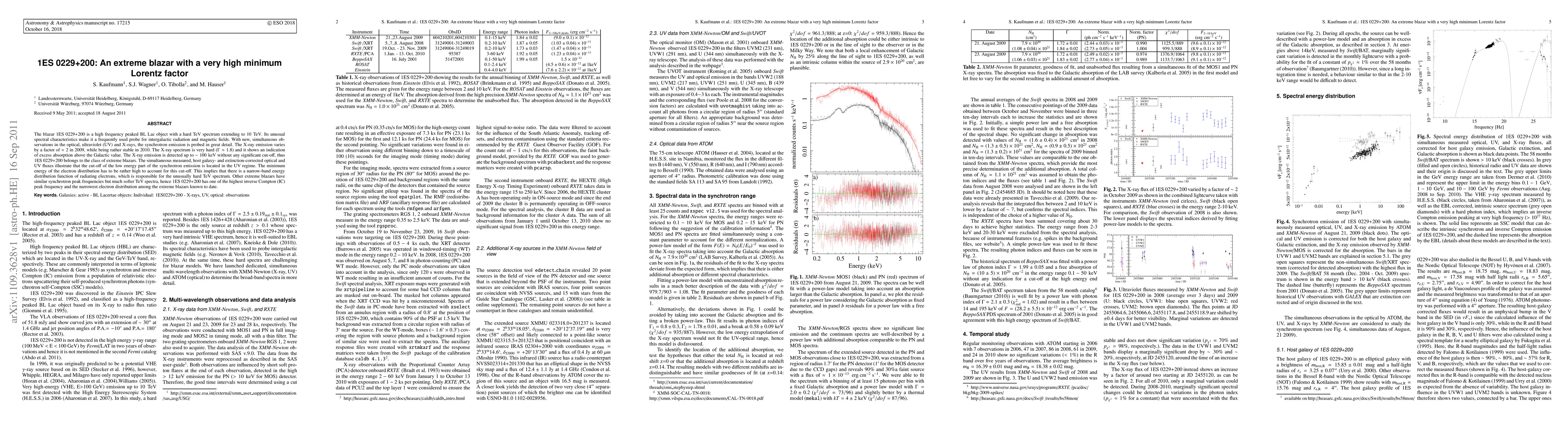 The blazar 1ES 0229+200 is a high frequency peaked BL Lac object with a hard TeV spectrum extending to 10 TeV. Its unusual spectral characteristics make it a frequently used probe for intergalactic radiation and magnetic fields. With new, simultaneous observations in the optical, ultraviolet (UV) and X-rays, the synchrotron emission is probed in great detail. The X-ray emission varies by a factor of ~2 in 2009, while being rather stable in 2010. The X-ray spectrum is very hard (\Gamma ~ 1.8) and it shows an indication of excess absorption above the Galactic value. The X-ray emission is detected up to ~100 keV without any significant cut-off, thus 1ES 0229+200 belongs to the class of extreme blazars. The simultaneous measured, host galaxy- and extinction-corrected optical and UV fluxes illustrate that the cut-off of the low energy part of the synchrotron emission is located in the UV regime. The minimum energy of the electron distribution has to be rather high to account for this cut-off. This implies that there is a narrow-band energy distribution function of radiating electrons, which is responsible for the unusually hard TeV spectrum. Other extreme blazars have similar synchrotron peak frequencies but much softer TeV spectra, hence 1ES 0229+200 has one of the highest inverse Compton (IC) peak frequency and the narrowest electron distribution among the extreme blazars known to date.
