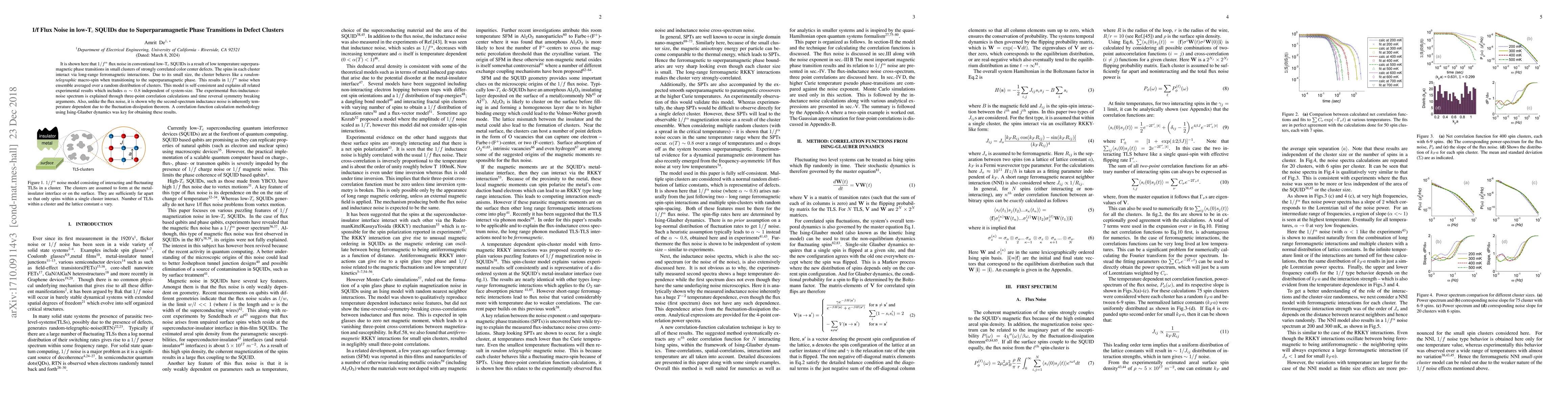 This paper demonstrates that $1/f^\alpha$ flux noise in low-temperature SQUIDs arises from superparamagnetic phase transitions in defect clusters, modeled as 'random-telegraphic' macro-spins. The study explains experimental results using three-point correlation and time reversal symmetry breaking, and highlights temperature dependence of inductance noise via fluctuation-dissipation theorem.