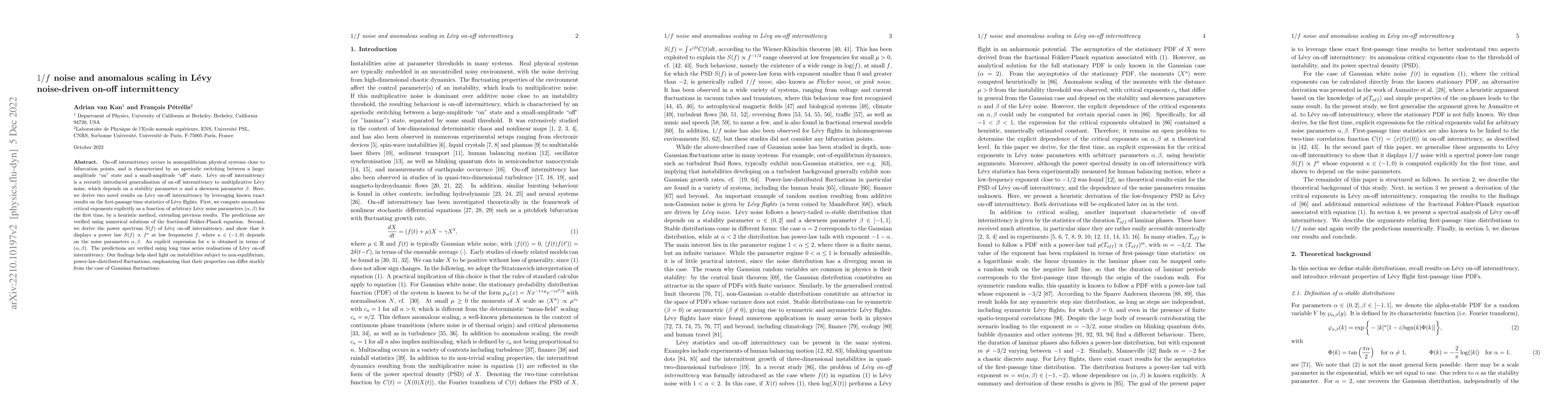 On-off intermittency occurs in nonequilibrium physical systems close to bifurcation points and is characterised by an aperiodic switching between a large-amplitude "on" state and a small-amplitude "off" state. L\'evy on-off intermittency is a recently introduced generalisation of on-off intermittency to multiplicative L\'evy noise, which depends on a stability parameter $\alpha$ and a skewness parameter $\beta$. Here, we derive two novel results on L\'evy on-off intermittency by leveraging known exact results on the first-passage time statistics of L\'evy flights. First, we compute anomalous critical exponents explicitly as a function of arbitrary L\'evy noise parameters $(\alpha,\beta)$ for the first time, by a heuristic method, complementing previous results. The predictions are verified using numerical solutions of the fractional Fokker-Planck equation. Second, we derive the power spectrum $S(f)$ of L\'evy on-off intermittency and show that it displays a power law $S(f)\propto f^\kappa$ at low frequencies $f$, where $\kappa\in (-1,0)$ depends on the noise parameters $\alpha,\beta$. An explicit expression for $\kappa$ is obtained in terms of $(\alpha,\beta)$. The predictions are verified using long time series realisations of L\'evy on-off intermittency. Our findings help shed light on instabilities subject to non-equilibrium, power-law-distributed fluctuations, emphasizing that their properties can differ starkly from the case of Gaussian fluctuations.