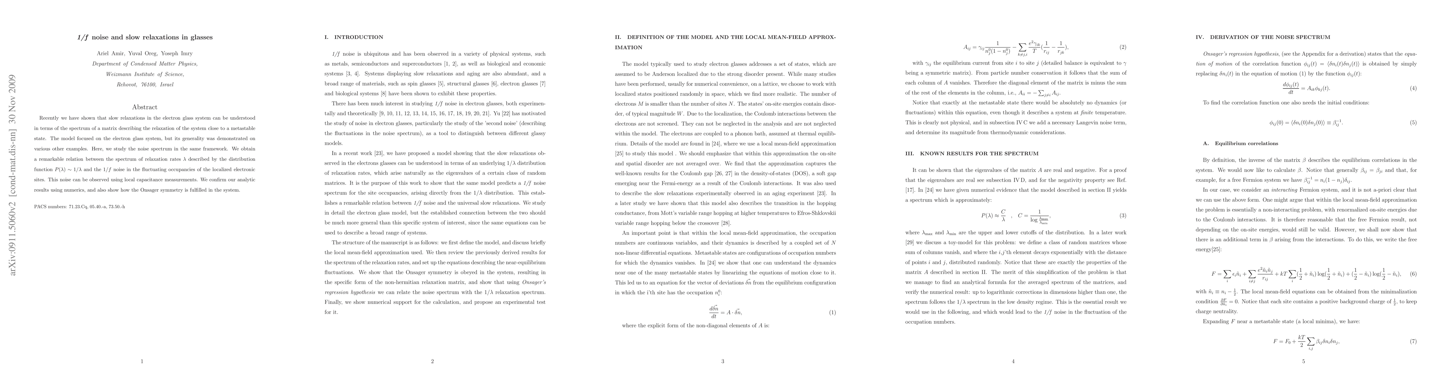 Recently we have shown that slow relaxations in the electron glass system can be understood in terms of the spectrum of a matrix describing the relaxation of the system close to a metastable state. The model focused on the electron glass system, but its generality was demonstrated on various other examples. Here, we study the noise spectrum in the same framework. We obtain a remarkable relation between the spectrum of relaxation rates $\lambda$ described by the distribution function $P(\lambda) \sim 1/\lambda$ and the $1/f$ noise in the fluctuating occupancies of the localized electronic sites. This noise can be observed using local capacitance measurements. We confirm our analytic results using numerics, and also show how the Onsager symmetry is fulfilled in the system.