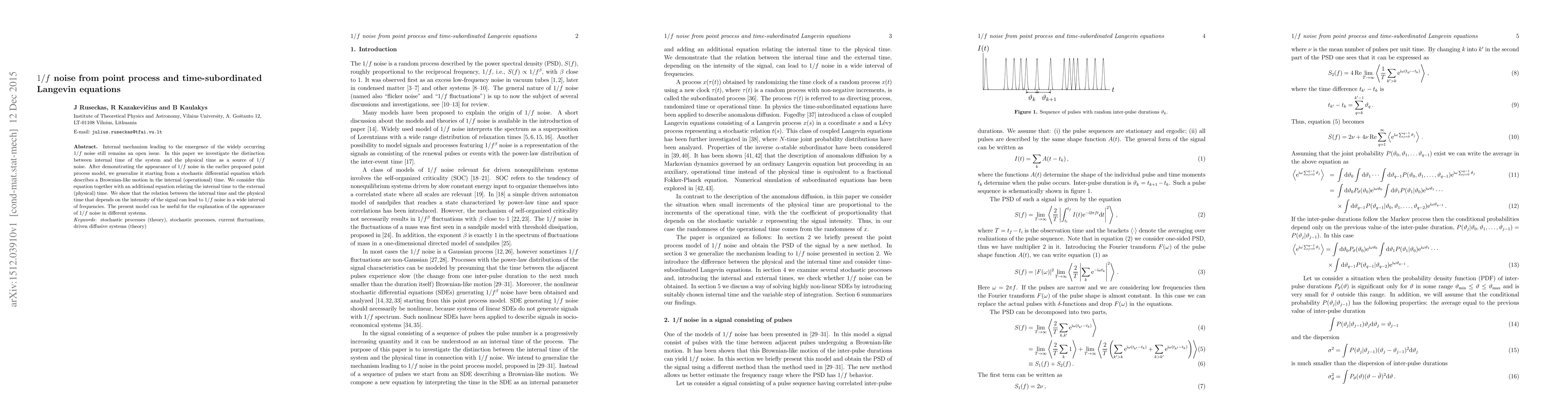 Internal mechanism leading to the emergence of the widely occurring 1/f noise still remains an open issue. In this paper we investigate the distinction between internal time of the system and the physical time as a source of 1/f noise. After demonstrating the appearance of 1/f noise in the earlier proposed point process model, we generalize it starting from a stochastic differential equation which describes a Brownian-like motion in the internal (operational) time. We consider this equation together with an additional equation relating the internal time to the external (physical) time. We show that the relation between the internal time and the physical time that depends on the intensity of the signal can lead to 1/f noise in a wide interval of frequencies. The present model can be useful for the explanation of the appearance of 1/f noise in different systems.