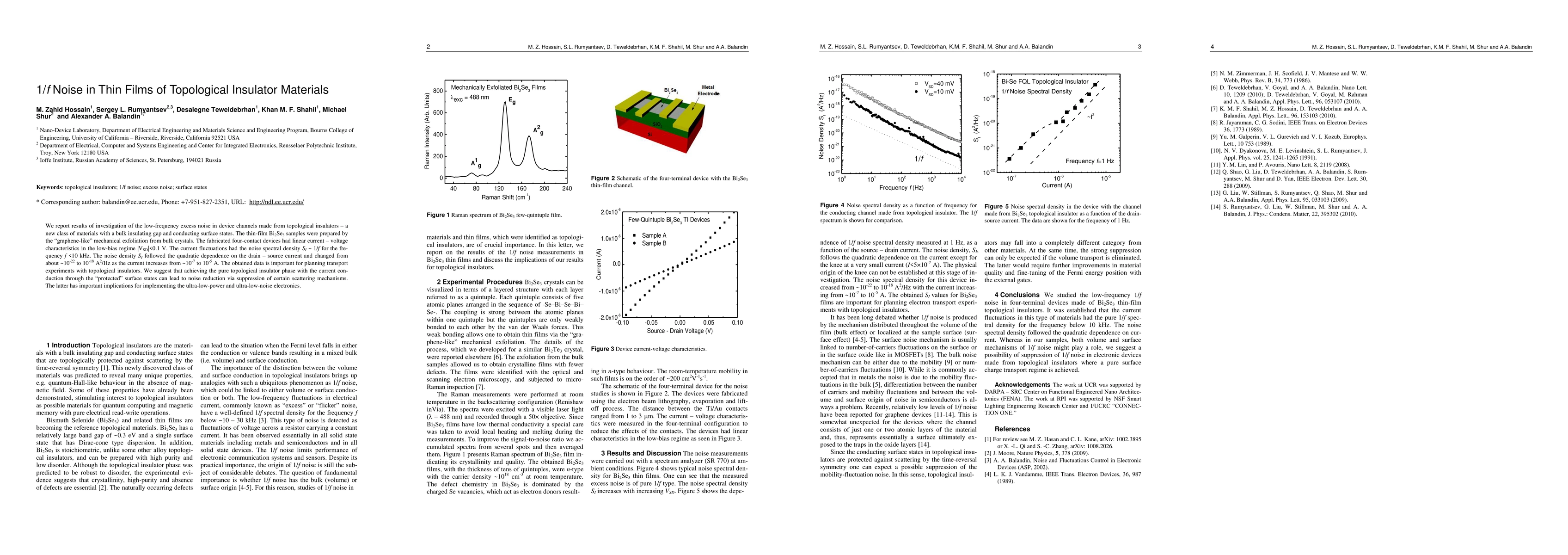 This paper investigates low-frequency excess noise in thin-film topological insulators, specifically bismuth selenide, revealing a 1/f noise spectral density below 10 kHz. The findings suggest that pure topological insulator phases could reduce noise by suppressing scattering mechanisms in surface states.
