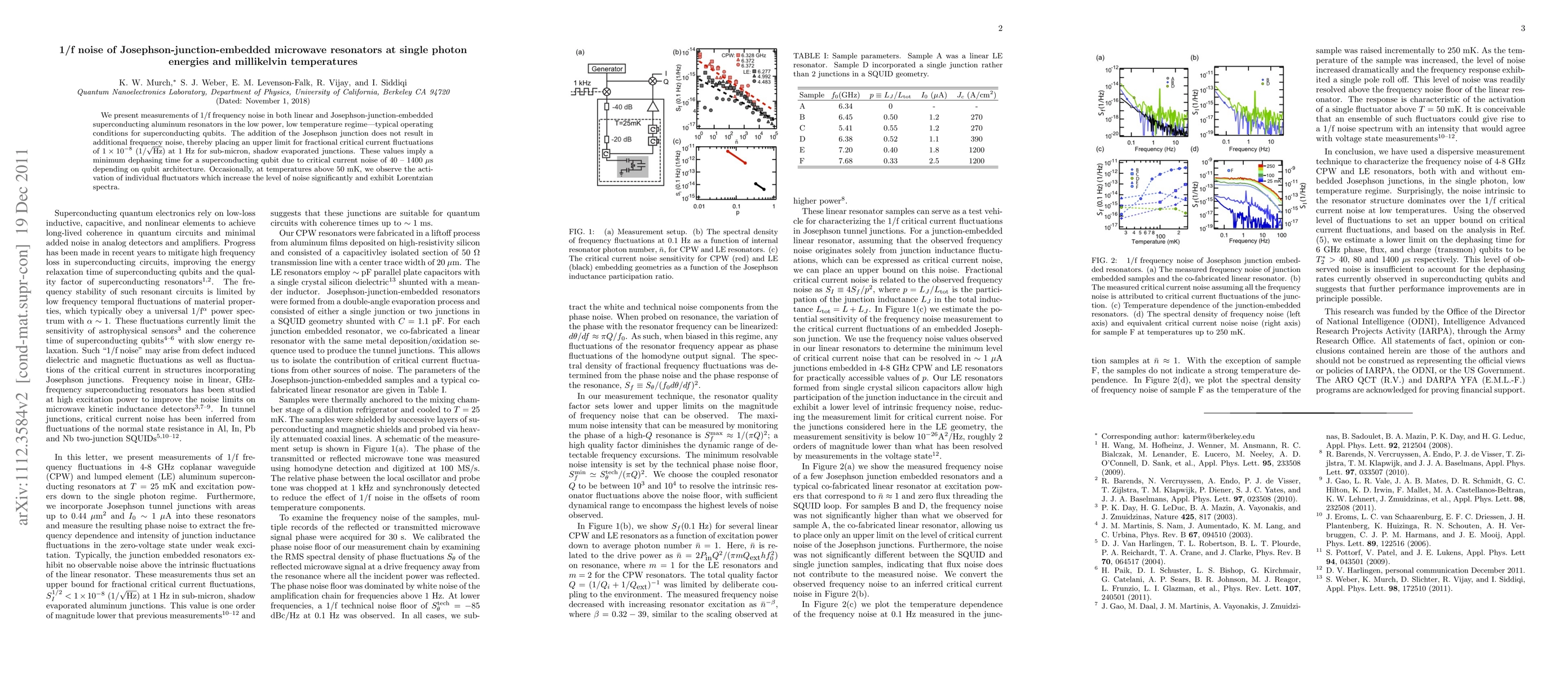 This paper investigates 1/f frequency noise in superconducting microwave resonators, finding that Josephson junctions do not increase noise, limiting critical current fluctuations to $10^{-8}$ (Hz$^{-1/2}$) at 1 Hz. It also notes occasional noise spikes above 50 mK due to activated fluctuators.