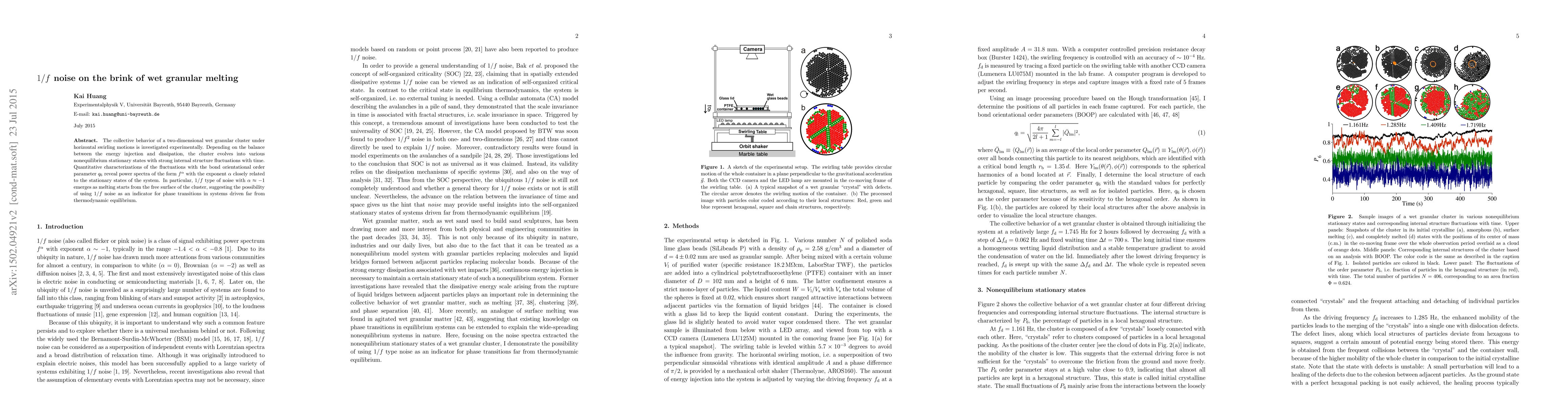 This paper investigates the collective behavior of a two-dimensional wet granular cluster under horizontal swirling motions, finding that $1/f$ noise emerges as the system transitions to a melted state, indicating its potential use as a phase transition indicator in nonequilibrium systems.