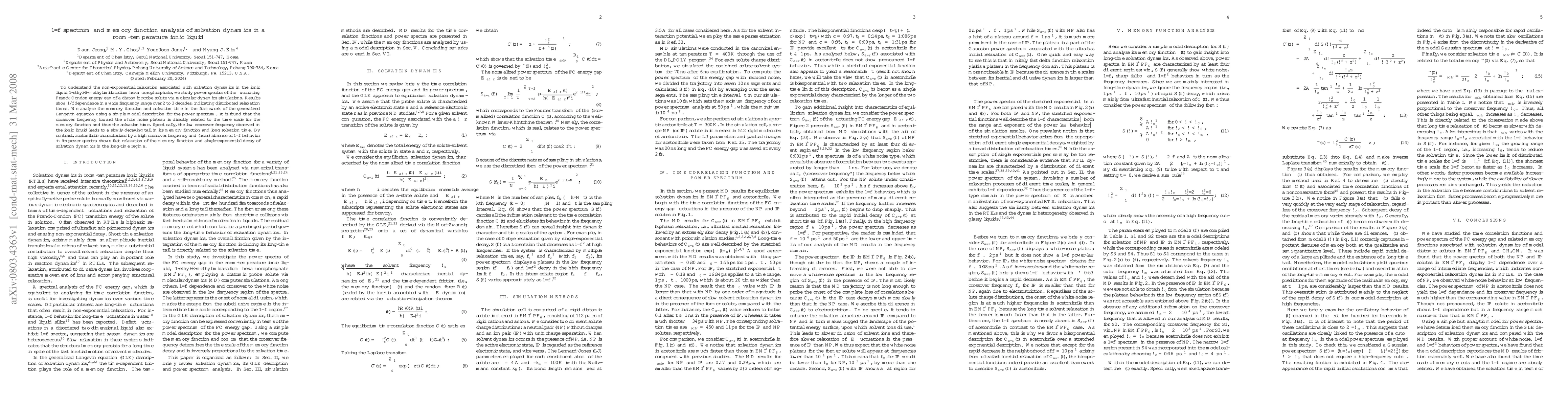 This paper investigates the 1/f spectrum and memory function of solvation dynamics in the ionic liquid 1-ethyl-3-methylimidazolium hexafluorophosphate, revealing distributed relaxation times and a long solvation time due to a low crossover frequency. In contrast, acetonitrile exhibits fast relaxation and single-exponential decay due to a high crossover frequency.