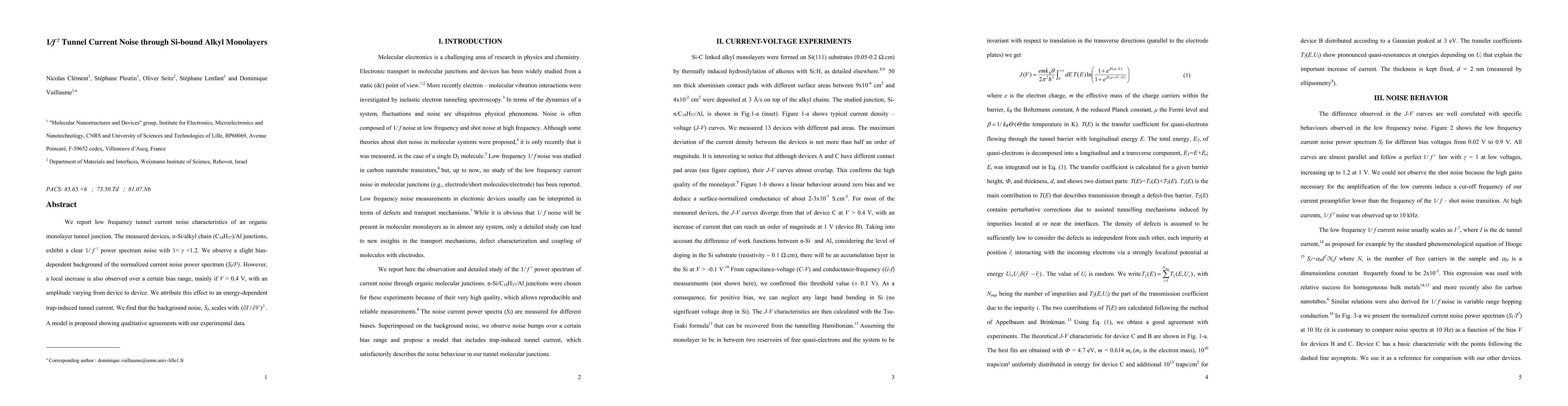 This study reports low-frequency tunnel current noise in organic monolayer tunnel junctions, with a 1/f^y power spectrum noise characteristic and a bias-dependent background noise.