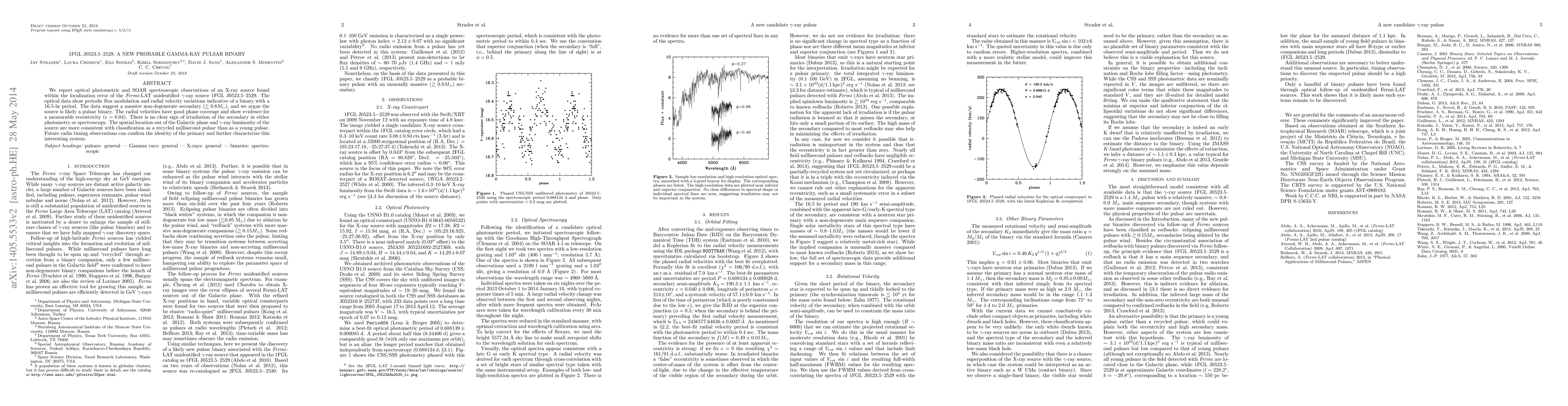 We report optical photometric and SOAR spectroscopic observations of an X-ray source found within the localization error of the Fermi-LAT unidentified gamma-ray source J0523.5-2529. The optical data show periodic flux modulation and radial velocity variations indicative of a binary with a 16.5-hr period. The data suggest a massive non-degenerate secondary (~> 0.8 M_sun), and we argue the source is likely a pulsar binary. The radial velocities have good phase coverage and show evidence for a measurable eccentricity (e=0.04). There is no clear sign of irradiation of the secondary in either photometry or spectroscopy. The spatial location out of the Galactic plane and gamma-ray luminosity of the source are more consistent with classification as a recycled millisecond pulsar than as a young pulsar. Future radio timing observations can confirm the identity of the primary and further characterize this interesting system.
