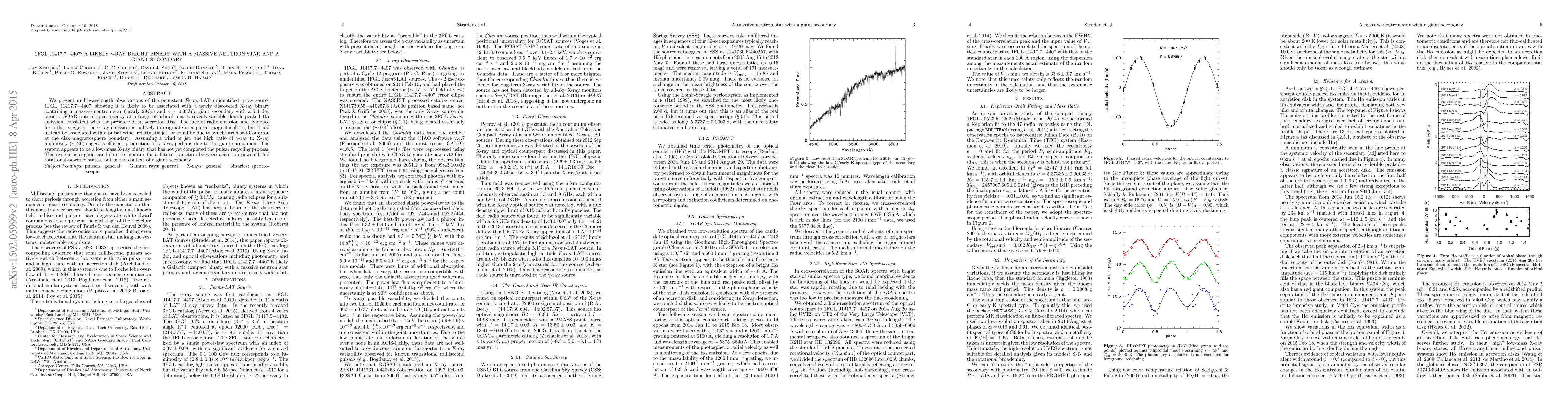 We present multiwavelength observations of the persistent Fermi-LAT unidentified gamma-ray source 1FGL J1417.7-4407, showing it is likely to be associated with a newly discovered X-ray binary containing a massive neutron star (nearly 2 M_sun) and a ~ 0.35 M_sun giant secondary with a 5.4 day period. SOAR optical spectroscopy at a range of orbital phases reveals variable double-peaked H-alpha emission, consistent with the presence of an accretion disk. The lack of radio emission and evidence for a disk suggests the gamma-ray emission is unlikely to originate in a pulsar magnetosphere, but could instead be associated with a pulsar wind, relativistic jet, or could be due to synchrotron self-Compton at the disk--magnetosphere boundary. Assuming a wind or jet, the high ratio of gamma-ray to X-ray luminosity (~ 20) suggests efficient production of gamma-rays, perhaps due to the giant companion. The system appears to be a low-mass X-ray binary that has not yet completed the pulsar recycling process. This system is a good candidate to monitor for a future transition between accretion-powered and rotational-powered states, but in the context of a giant secondary.