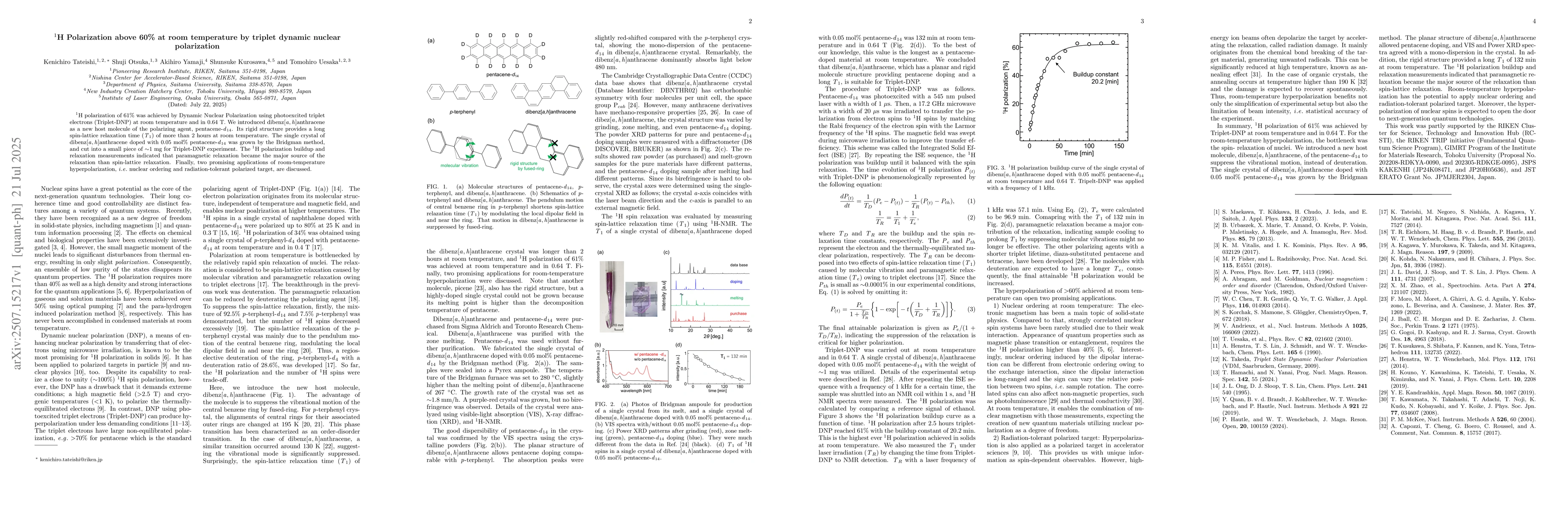 1H polarization of 61% was achieved by Dynamic Nuclear Polarization using photoexcited triplet electrons (Triplet-DNP) at room temperature and in 0.64 T. We introduced dibenz[a, h]anthracene as a new host molecule of the polarizing agent, pentacene-d14. Its rigid structure provides a long spin-lattice relaxation time (T1) of more than 2 hours at room temperature. The single crystal of dibenz[a, h]anthracene doped with 0.05 mol% pentacene-d14 was grown by the Bridgman method, and cut into a small piece of ~1 mg for Triplet-DNP experiment. The 1H polarization buildup and relaxation measurements indicated that paramagnetic relaxation became the major source of the relaxation than spin-lattice relaxation. Finally, two promising applications of room-temperature hyperpolarization, i .e. nuclear ordering and radiation-tolerant polarized target, are discussed.