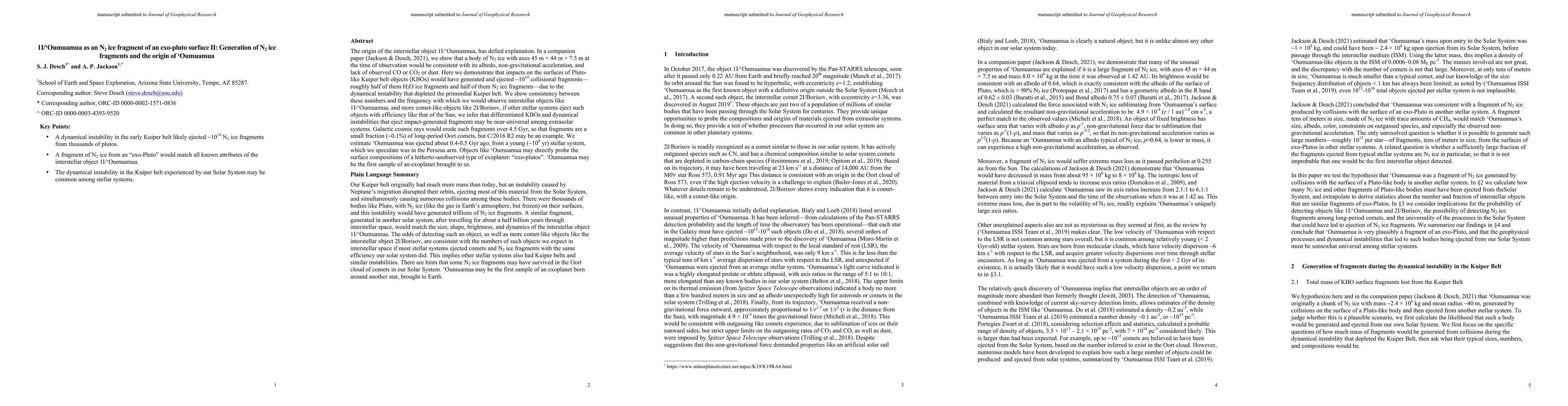 The origin of the interstellar object 1I/'Oumuamua, has defied explanation. In a companion paper (Jackson & Desch, 2021), we show that a body of N2 ice with axes 45 m x 44 m x 7.5 m at the time of observation would be consistent with its albedo, non-gravitational acceleration, and lack of observed CO or CO2 or dust. Here we demonstrate that impacts on the surfaces of Pluto-like Kuiper belt objects (KBOs) would have generated and ejected ~10^14 collisional fragments--roughly half of them H2O ice fragments and half of them N2 ice fragments--due to the dynamical instability that depleted the primordial Kuiper belt. We show consistency between these numbers and the frequency with which we would observe interstellar objects like 1I/'Oumuamua, and more comet-like objects like 2I/Borisov, if other stellar systems eject such objects with efficiency like that of the Sun; we infer that differentiated KBOs and dynamical instabilities that eject impact-generated fragments may be near-universal among extrasolar systems. Galactic cosmic rays would erode such fragments over 4.5 Gyr, so that fragments are a small fraction (~0.1%) of long-period Oort comets, but C/2016 R2 may be an example. We estimate 'Oumuamua was ejected about 0.4-0.5 Gyr ago, from a young (~10^8 yr) stellar system, which we speculate was in the Perseus arm. Objects like 'Oumuamua may directly probe the surface compositions of a hitherto-unobserved type of exoplanet: "exo-plutos". 'Oumuamua may be the first sample of an exoplanet brought to us.