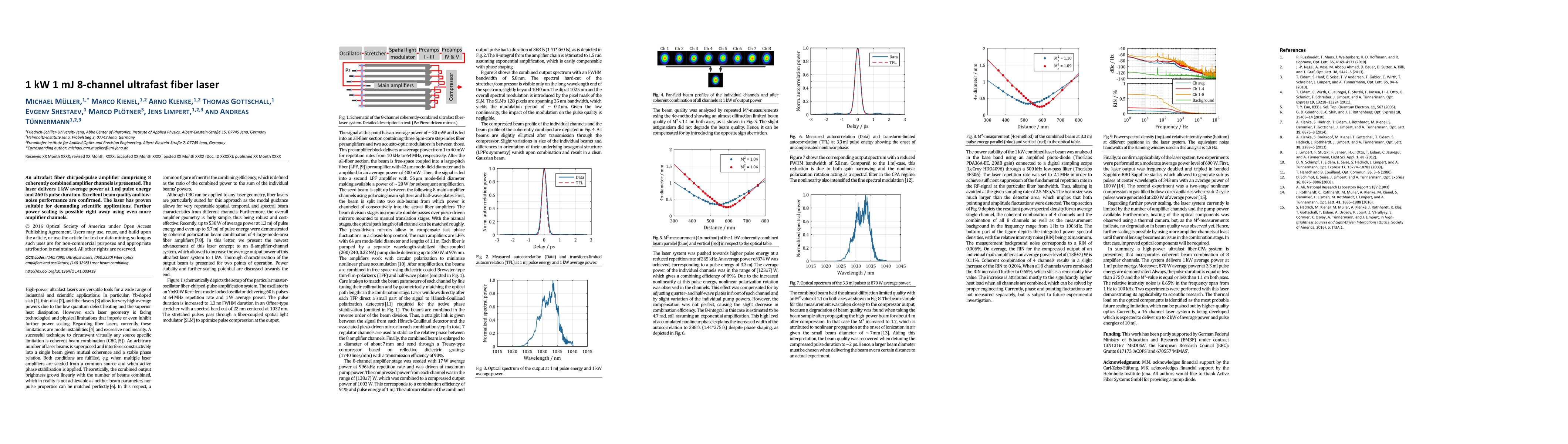 An ultrafast fiber chirped-pulse amplifier comprising 8 coherently combined amplifier channels is presented. The laser delivers 1 kW average power at 1 mJ pulse energy and 260 fs pulse duration. Excellent beam quality and low noise performance are confirmed. The laser has proven suitable for demanding scientific applications. Further power scaling is possible right away using even more amplifier channels