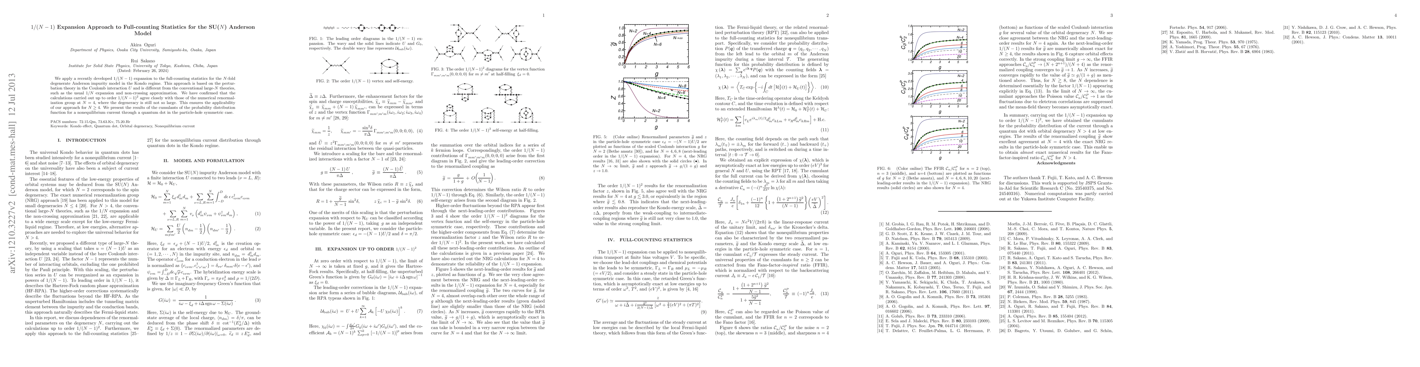 This paper applies a novel 1/(N-1) expansion to study the full counting statistics for the SU(N) Anderson impurity model in the Kondo regime, showing close agreement with numerical renormalization group results at N=4, thus validating the method for larger N. The study presents cumulants of the probability distribution for nonequilibrium current through a quantum dot in particle-hole symmetric conditions.