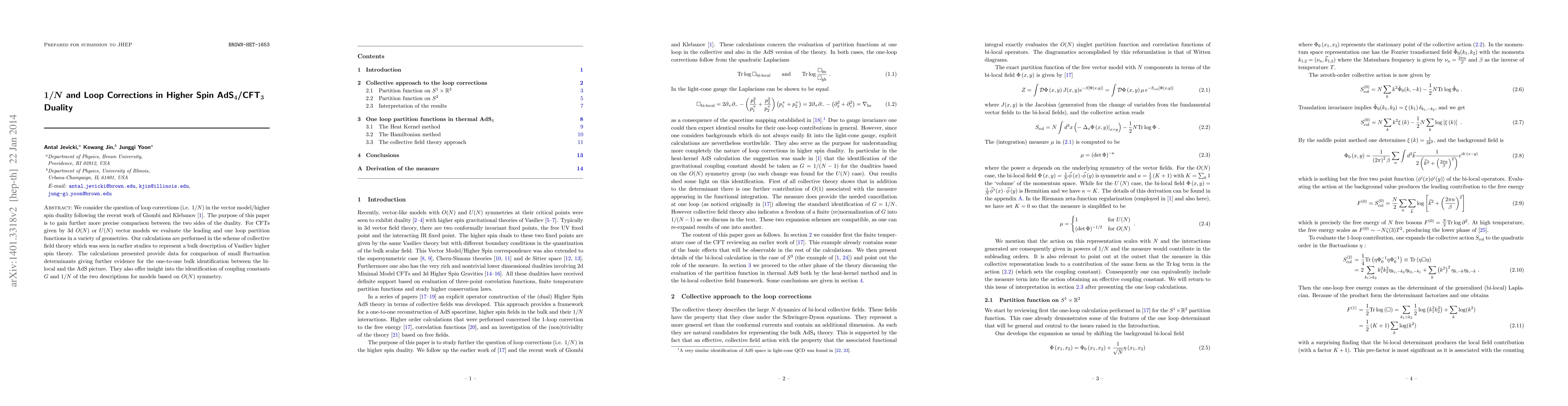 We consider the question of loop corrections (i.e. 1/N) in the vector model/higher spin duality following the recent work of Giombi and Klebanov. The purpose of this paper is to gain further more precise comparison between the two sides of the duality. For CFTs given by 3d O(N) or U(N) vector models we evaluate the leading and one loop partition functions in a variety of geometries. Our calculations are performed in the scheme of collective field theory which was seen in earlier studies to represent a bulk description of Vasiliev higher spin theory. The calculations presented provide data for comparison of small fluctuation determinants giving further evidence for the one-to-one bulk identification between the bi-local and the AdS picture. They also offer insight into the identification of coupling constants G and 1/N of the two descriptions for models based on O(N) symmetry.