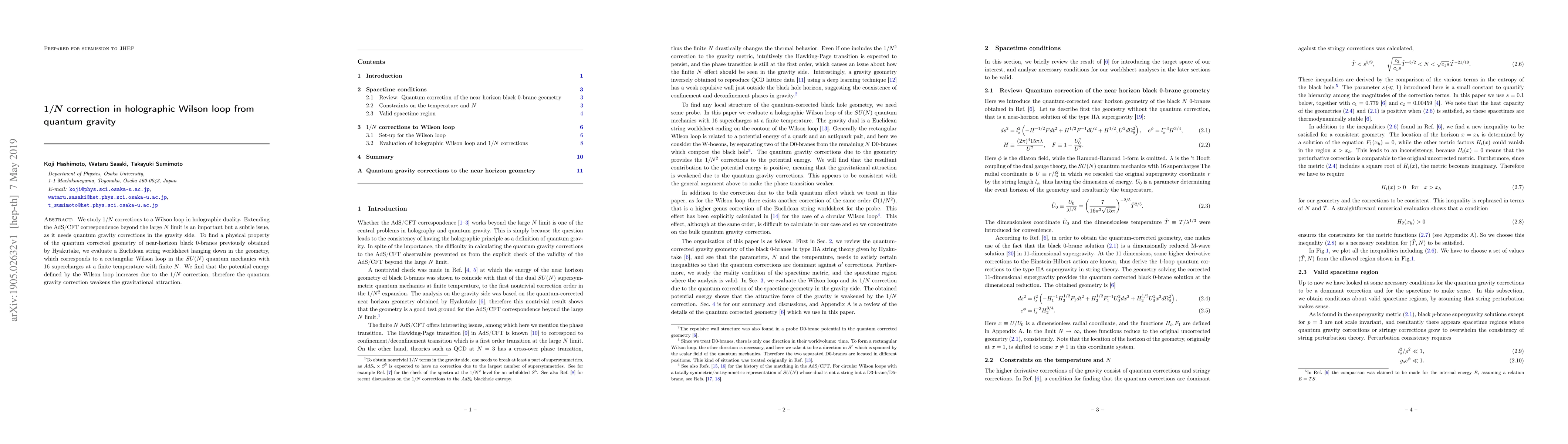 This paper investigates $1/N$ corrections to a Wilson loop in holographic duality, extending the AdS/CFT correspondence beyond the large $N$ limit. It finds that quantum gravity corrections increase the potential energy of the Wilson loop, thereby weakening gravitational attraction.
