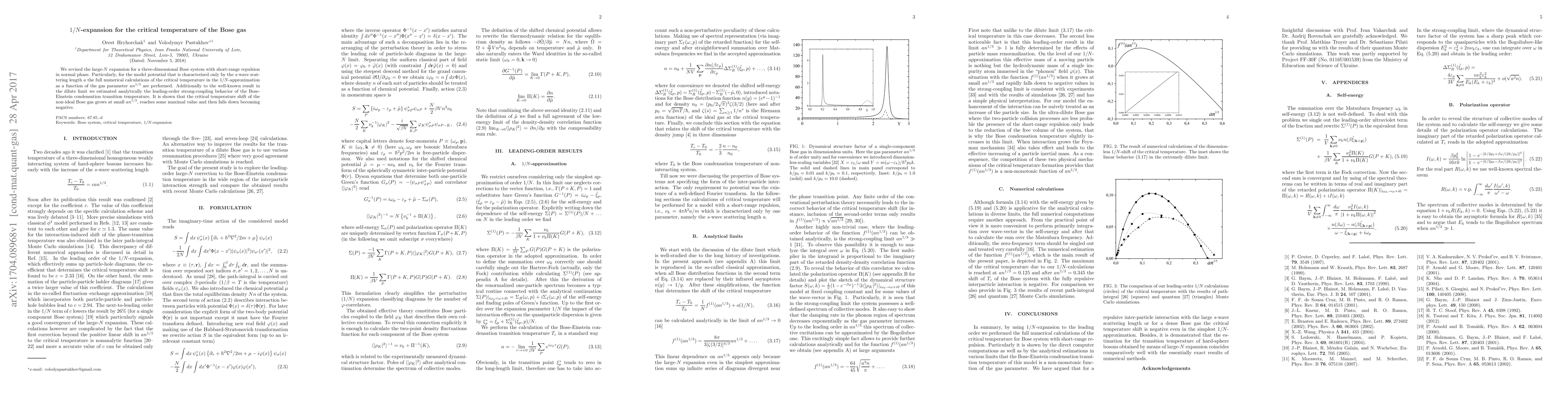 This paper revises the large-$N$ expansion for a three-dimensional Bose gas with short-range repulsion, focusing on the $1/N$-approximation. It numerically calculates the critical temperature as a function of the gas parameter $an^{1/3}$, revealing that the critical temperature shift first increases, reaches a maximum, and then becomes negative at small $an^{1/3}$.